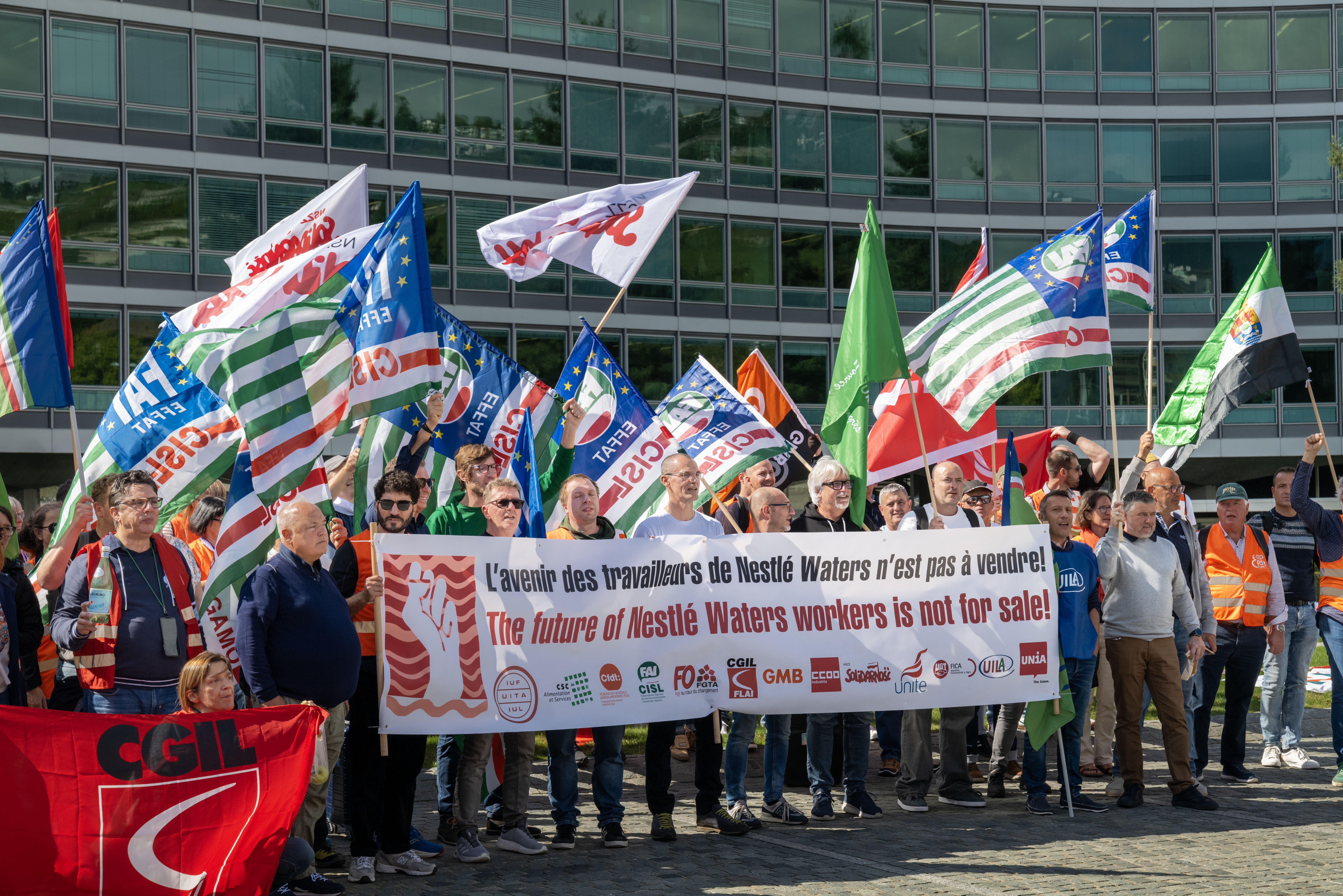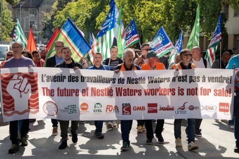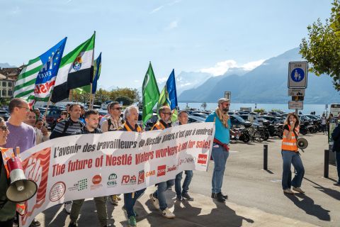 La manifestation, soutenue par l'UITA (Union internationale des travailleurs et travailleuses de l'alimentation) et Unia, qui en assure la logistique, part de la place du Marché pour rallier le quartier général de la multinationale helvétique, en empruntant notamment l’avenue… Nestlé! Près de 150 personnes y participent, défilant dans les rues de la paisible cité aux cris de «Solidarité avec les travailleurs de Nestlé Waters!». Cette division, qui regroupe de nombreuses marques bien connues d’eau minérale – dont Perrier, San Pellegrino, Vittel, Contrex, Hépar, ou encore Henniez – emploie plus de 5500 personnes en Europe, et 33 000 dans le monde entier. Or, elle devrait être cédée à un partenaire.