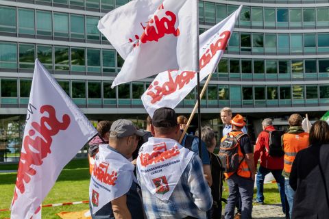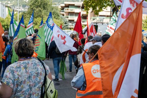 Une forêt de drapeaux multicolores a poussé au pied de l’imposant siège mondial de Nestlé, à Vevey, ce lundi 29 septembre. Ce sont les étendards d’une douzaine de syndicats des quatre coins de l’Europe, venus défendre les emplois que menace le projet de vente de la division Nestlé Waters par le géant de l’agroalimentaire. Il y a là des salariées et des salariés qui ont fait un long voyage – de France, Italie, Espagne, Belgique, Allemagne, Royaume-Uni et même Pologne – pour crier leur colère et asséner que leur «avenir n’est pas à vendre». Des médias français couvrent l’événement, dont France 3.