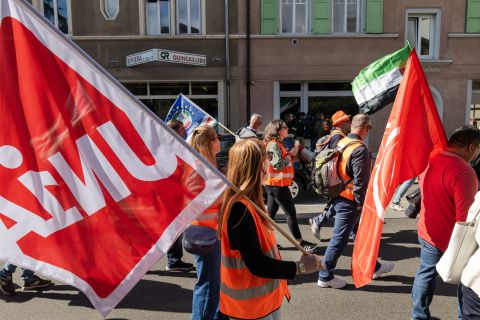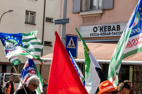 «Habitants de Vevey, joignez-vous à nous!», lance un syndicaliste français à la cantonade. Un appel qui laisse indifférents les étudiants d’un centre de formation professionnelle devant lequel passe le cortège. En revanche, accoudée à son SUV Lexus immobilisé par le défilé, une dame d’allure bourgeoise reprend les slogans en chœur, poing levé.