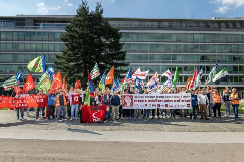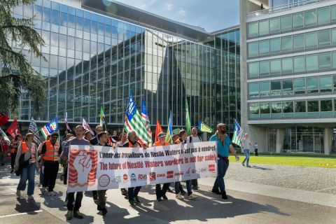 Des salariés de toute l’Europe crient leur colère devant le siège de Nestlé