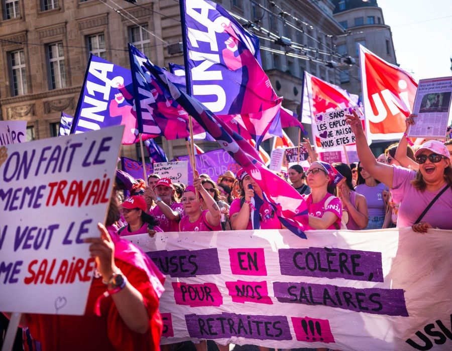 Grèves, pauses de protestation, défilés: plus de 300000 personnes ont participé à la Grève féministe du 14 juin. Une journée écrite à l’encre violette qui s’est invitée dans plusieurs entreprises et dans l’espace public. Au nom d’une égalité qui n’est toujours pas réalisée. Afin de réclamer du temps, du respect, de l’argent, mot d’ordre des travailleuses luttant, avec le soutien d’Unia, pour des rémunérations et des rentes suffisantes pour vivre, des horaires de travail équitables, la fin des discriminations et du harcèlement sexuel. En plus des manifestations et des cortèges traditionnels, différentes actions et rassemblements sur les lieux de travail ont ainsi été mis sur pied. En Suisse romande, des mobilisations se sont déroulées dans le secteur de l’industrie horlogère: des ouvrières se sont réunies dans les cantons de Genève, Vaud et Neuchâtel afin de dénoncer les différences salariales avec leurs homologues masculins et d’exiger une meilleure protection contre la violence sexualisée. A Lausanne et dans la ville du bout du lac, des vendeuses ont organisé des actions pour protester contre les bas salaires dans la branche, le temps partiel contraint ou encore la difficulté de concilier la vie professionnelle et la vie familiale. Dans le canton de Vaud, des assistantes en pharmacie ont, elles aussi, dénoncé des rémunérations bien en dessous des compétences et des responsabilités nécessaires à l’exercice de leur métier et exigé la signature d’une convention collective de travail. A Fribourg, les employées d’une blanchisserie se sont réunies à midi pour une pause prolongée... Quelques exemples de luttes dont plusieurs sont relatées au fil des pages de cette édition spéciale pour une journée extraordinaire, portées par des femmes combattives, fortes et fières.