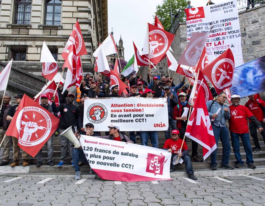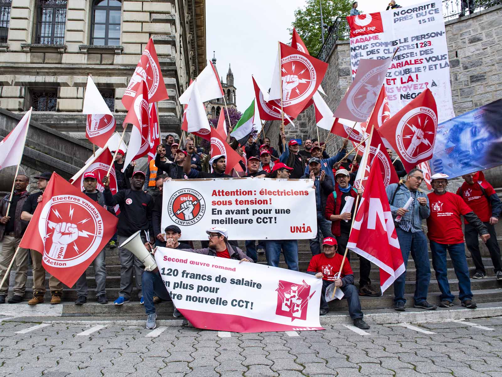 Des électros et des membres du second œuvre sur la place de la Riponne lors du 1er Mai à Lausanne.