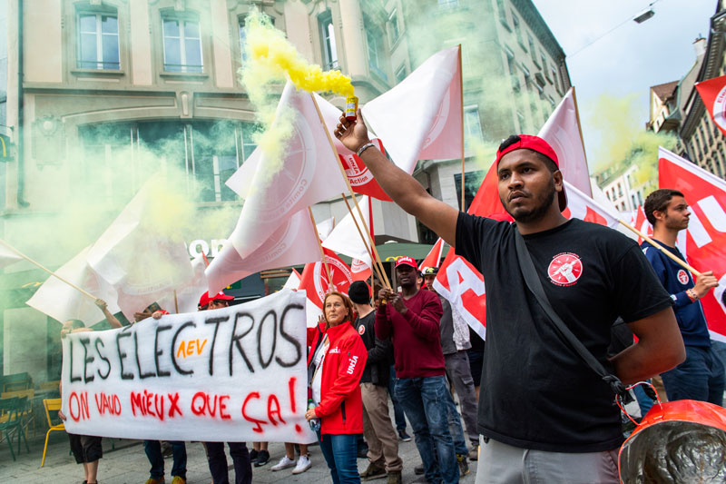 La pluie en a sûrement découragé plus d’un. Mais ils étaient tout de même une centaine de manifestants mardi 12 juin à se réunir sur la place de la Riponne devant le bâtiment d’Unia. Entre deux averses, le cortège s’ébranle bruyamment, fumigènes et banderoles en prime. Une action coup de poing organisée par le Comité d’action Unia des électriciens vaudois (CAEV) en écho à la manifestation nationale du 19 mai à Zurich.