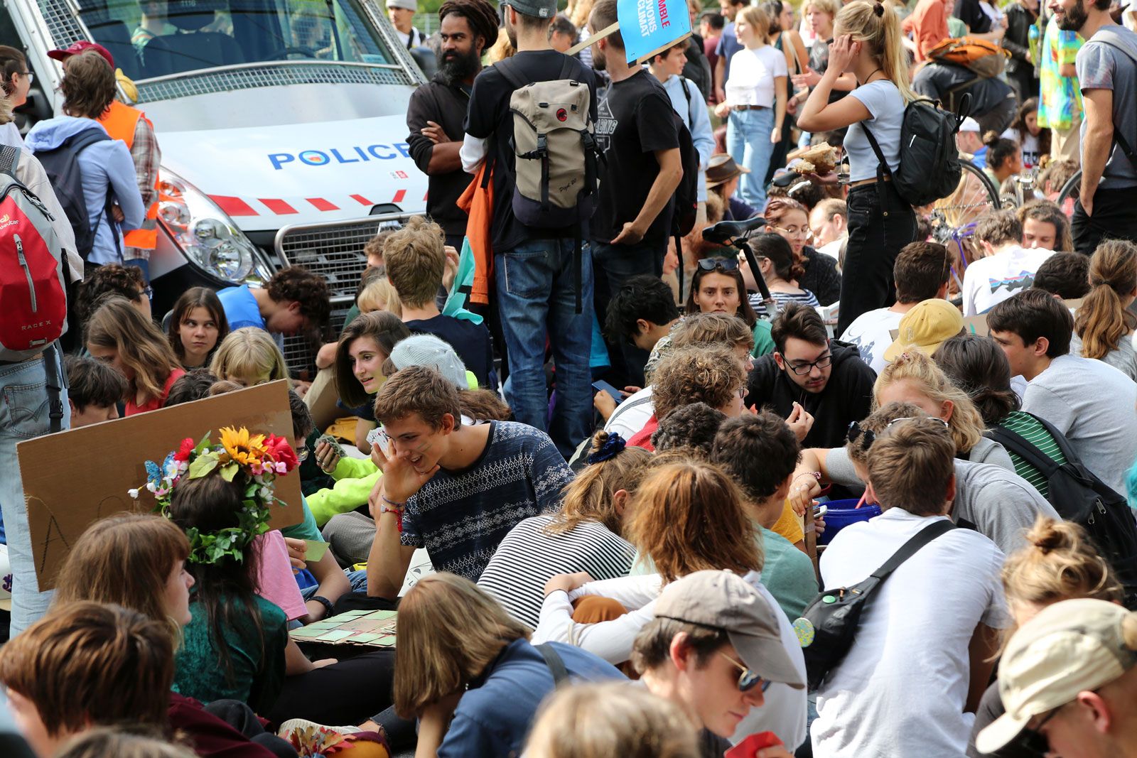 La sommation de la police intervient peu après: la manifestation doit se dissoudre, sinon les agents effectueront des interpellations et des arrestations. L’heure de la conférence de presse est avancée, alors que le cordon de police avance lui aussi. Layla Outemzabet, de la Grève du climat, rappelle l’Acte 1 du mouvement: les enjeux climatiques sont sur le devant de la scène grâce à la mobilisation des étudiants, le mouvement a su se structurer à tous les niveaux, du local à l’international. «En participant au Plan climat Vaud, on a vu les limites des politiques, sous influence des lobbies économiques. Au niveau fédéral, le débat sur l’initiative pour des multinationales responsables a été encore repoussé cette semaine. On se fout de nous! Le gouvernement vaudois ne comprend pas les enjeux et ne s’informe pas. Sinon il serait ici!» Son camarade de lutte, Steven Tamburini, assène:«Pour ces raisons et beaucoup d’autres, nous entrons dans l’Acte 2. Soit une remobilisation sur nos lieux de formation, mais aussi en élargissant la lutte au monde du travail, avec la Grève féministe et si possible les syndicats. Nous multiplierons les actions des plus institutionnelles et habituelles aux plus radicales, toujours pacifiquement, jusqu’à une grève générale économique le 15 mai 2020, en Suisse et à l’international.»