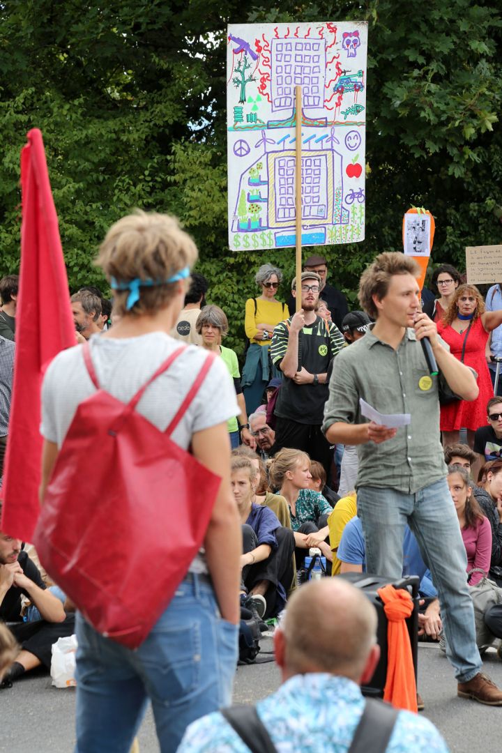 Sous un soleil de plomb, la police demande à nouveau la dissolution de la manifestation. Marine Ehemann, de la Grève féministe, reprend la parole pour dénoncer la surproduction, le gaspillage insensé, les inégalités. «Plus nous échangeons et plus nous nous rendons compte de l’imbrication de nos luttes!» La conclusion revient au scientifique et membre des Grands-parents pour le climat, Jacques Dubochet: «Où est la légalité? La légalité est de sauver l’avenir de nos enfants. Nous avons la nécessité d’agir maintenant!»