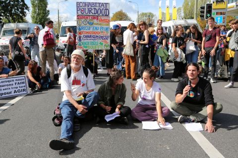 Parmi les quelques centaines de manifestants présents à l’action, les anciens sont présents en nombre, dont certains sont membres de l’association Grands-parents pour le climat, telle Isabelle Veillon: «Il faut faire quelque chose, illico presto! Nous vivons dans une dictature de l’économie! Les changements nécessaires et urgents sont bloqués par les riches!» Et de désigner du doigt une pancarte, symbole de l’urgence, sur laquelle un adulte demande: «Et toi petit, tu veux être quoi plus tard?» Et l’enfant de répondre: «Vivant.»
