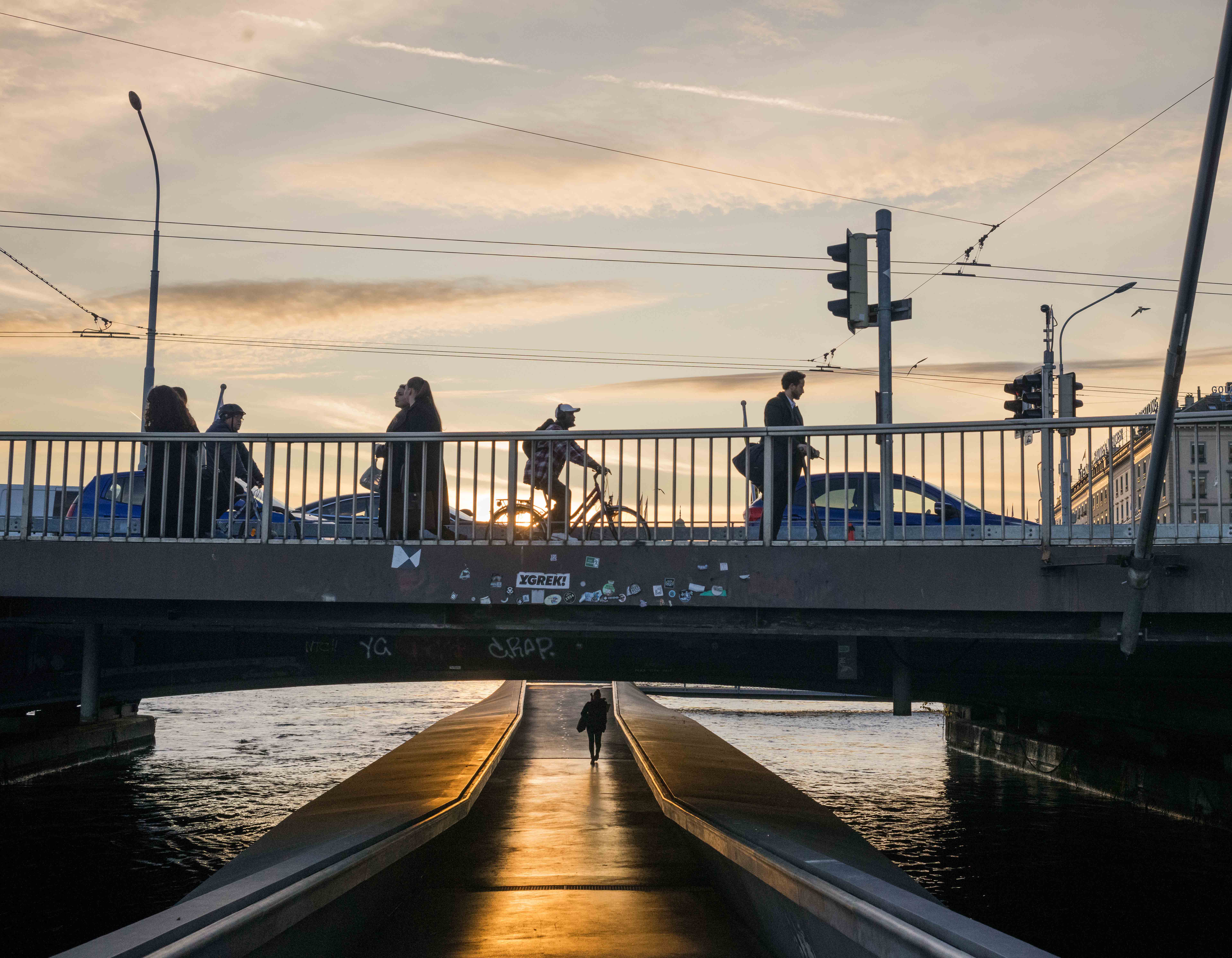 Après le flop de la passerelle du Mont-Blanc, coulée dans les urnes lors des dernières votations du 24 novembre, les Genevois vont se contenter de «marcher» sur l'eau. Ils continueront à emprunter le passage flottant qui relie le quai des Bergues au quai du Mont-Blanc. Cet itinéraire, qui évite les nuisances du trafic, offre une vue singulière de l’architecture du pont.