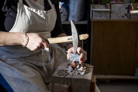 Munie d’une marteline, un tranchet fixé sur un billot, Adriana Cavallaro réduit en petits morceaux un bout de marbre détaillé au préalable à l’aide d’une machine de coupe. Le geste est sûr, précis, répétitif. Et sonne agréablement aux oreilles de la mosaïste. «C’est comme une musique. J’aime beaucoup cette étape. J’y passe des heures», s’enthousiasme la ressortissante italienne de 46 ans dans un français aux chaleureux accents de son pays. Dans son lumineux atelier lausannois aux murs décorés de ses fresques de pierre composant un ensemble hétéroclite, la mosaïste s’abandonne à la cadence de sa frappe. Et débite en fragments toujours plus petits la roche blanche avant de s’interrompre pour saisir un morceau de granit. «Ecoutez, le granit, plus dur, plus compact, génère des tonalités différentes», assure la spécialiste, soulignant l’importance de la taille des matériaux, la finesse et l’harmonie du modèle dépendant de la forme et de la régularité des tesselles autant que du sens de leur agencement. Et d’ajouter qu’elle adore les pierres, y compris en bijoux, comme en témoignent ses bracelets et ses boucles d’oreilles en gemmes naturelles. «Elles dégagent une énergie», affirme la quadragénaire, précisant que celles de couleur noire ne lui font toutefois pas du bien...