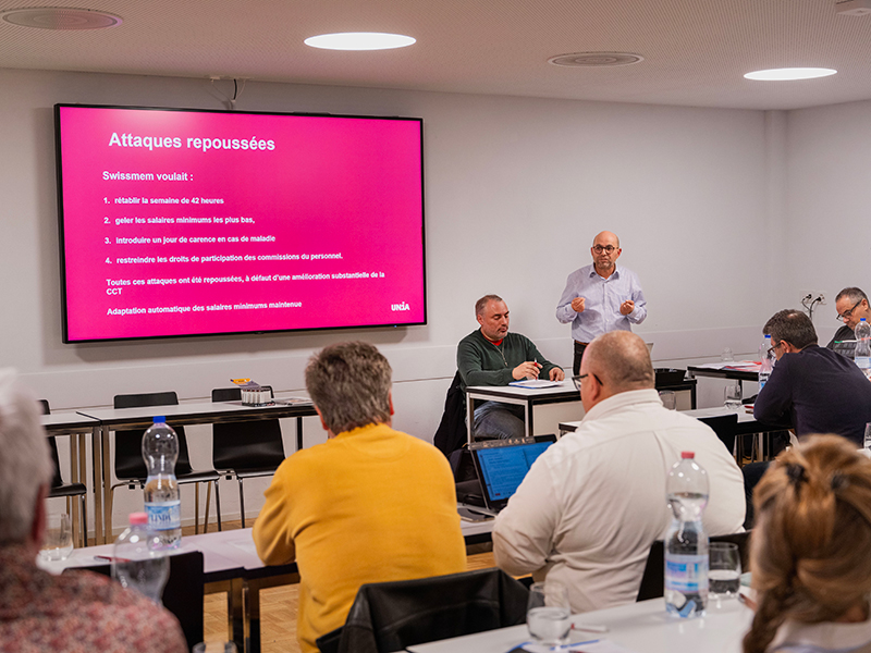 Il est notamment revenu sur les négociations de renouvellement de la CCT des machines. «Swissmem, l’association patronale, est arrivée avec des propositions inacceptables: retour à la semaine de 42 heures, semaine de 6 jours de travail, suppression du renchérissement automatique pour les salaires minimaux, introduction d’un jour de carence en cas de maladie ou encore restriction du droit de participation des commissions du personnel. Nous avons pu repousser les attaques, ce qui n’était pas facile, les autres syndicats, notamment Employés Suisse, étaient prêts à négocier les 42 heures avec du travail sur 6 jours: ils appellent ça “améliorer la vie des salariés”.»
