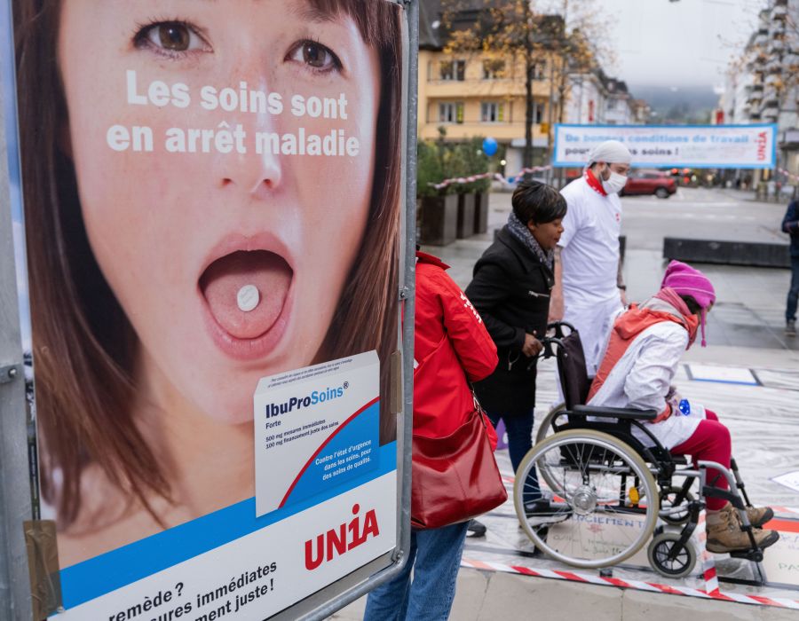 Unia a animé plusieurs actions pour dénoncer l’état des soins infirmiers. Ici, à Delémont, en novembre 2023.