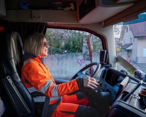 Retour à l’intérieur de son imposant Volvo FMX. La route est juste assez large pour croiser cette grosse camionnette de livraison. «A cause du poids du véhicule et de son gabarit, la conduite est bien différente de celle d’une voiture. Même à vide, un 40 tonnes ne freine pas et ne réagit pas comme une auto. Il faut vraiment avoir les yeux partout.» Piloter un tel engin nécessite sang-froid et concentration, ce qui induit forcément de la fatigue. Embarqué à bord, le tachygraphe veille à ce que notre chauffeure se conforme aux prescriptions en vigueur sur les temps de travail et de repos.