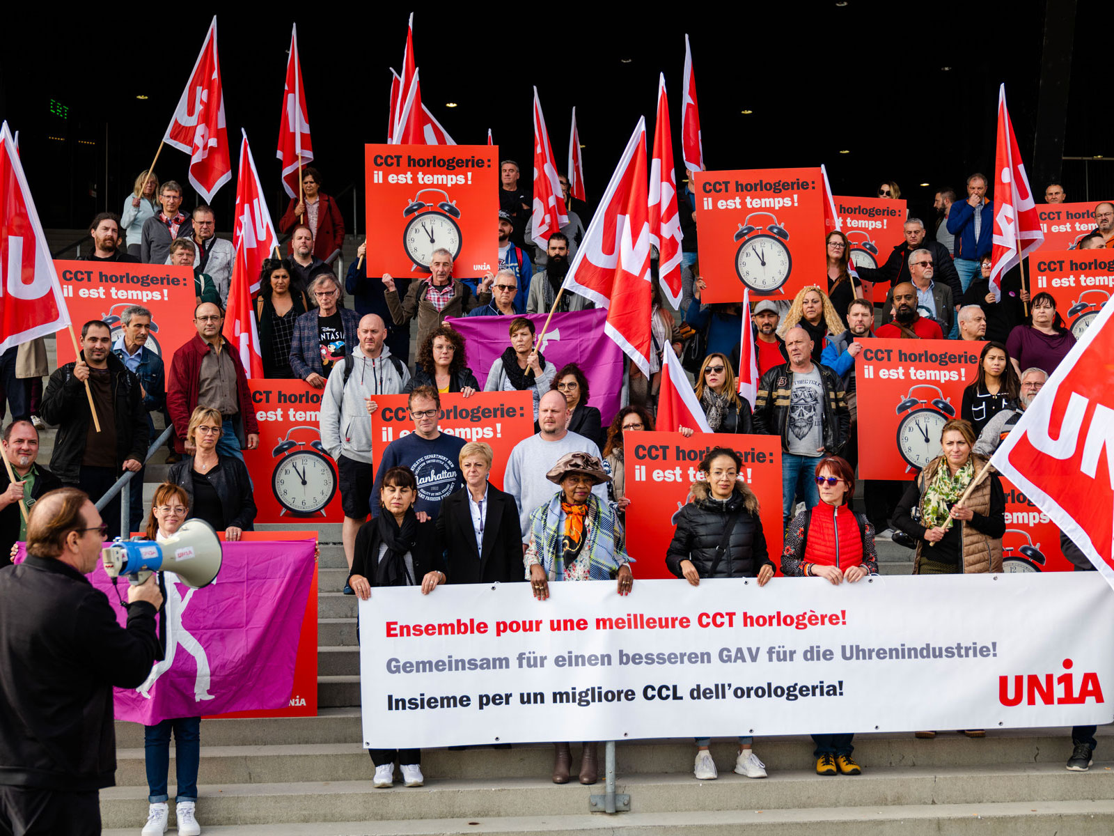 Travailleurs de l'horlogerie avec banderoles et drapeaux.