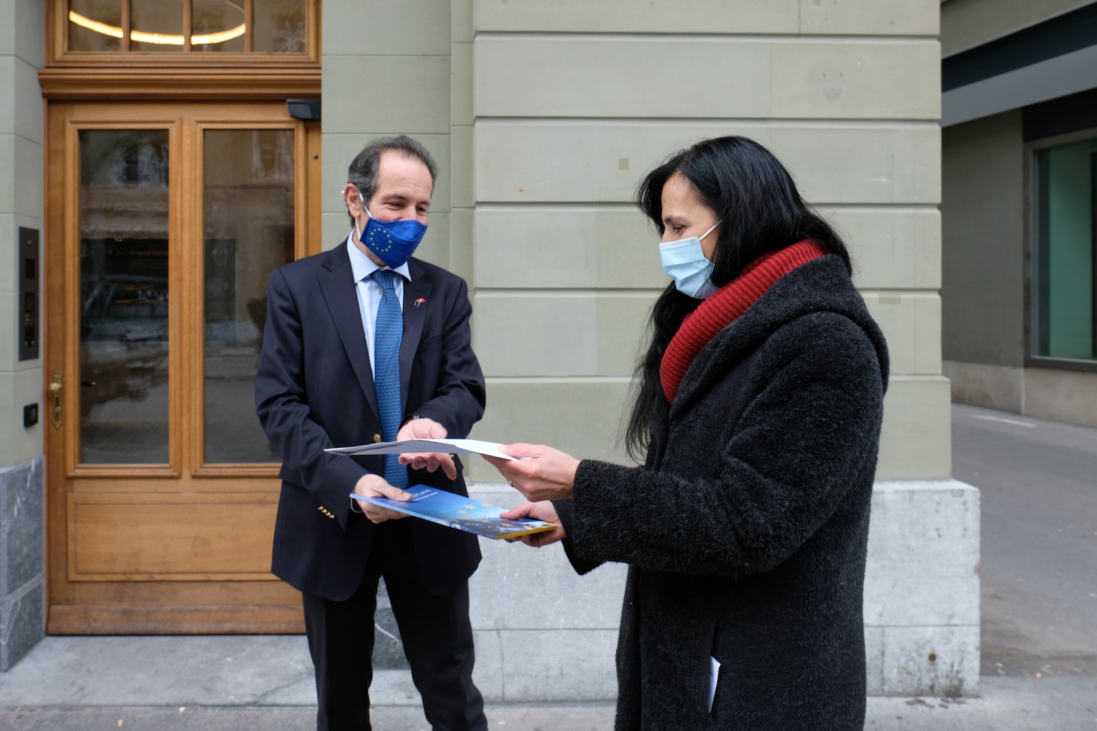 Vania Alleva, présidente d’Unia a remis une lettre à Petros Mavromichalis, ambassadeur de l’Union européenne, avant de s’entretenir avec ce dernier. La discussion a porté sur les mesures d’accompagnement, dispositions sur lesquelles le syndicat ne transigera pas. © Lucas Dubuis/Unia