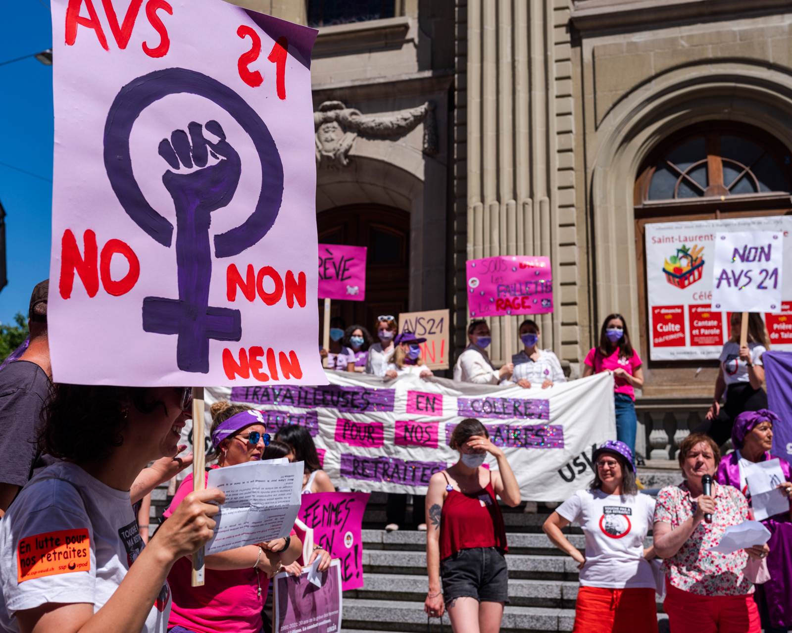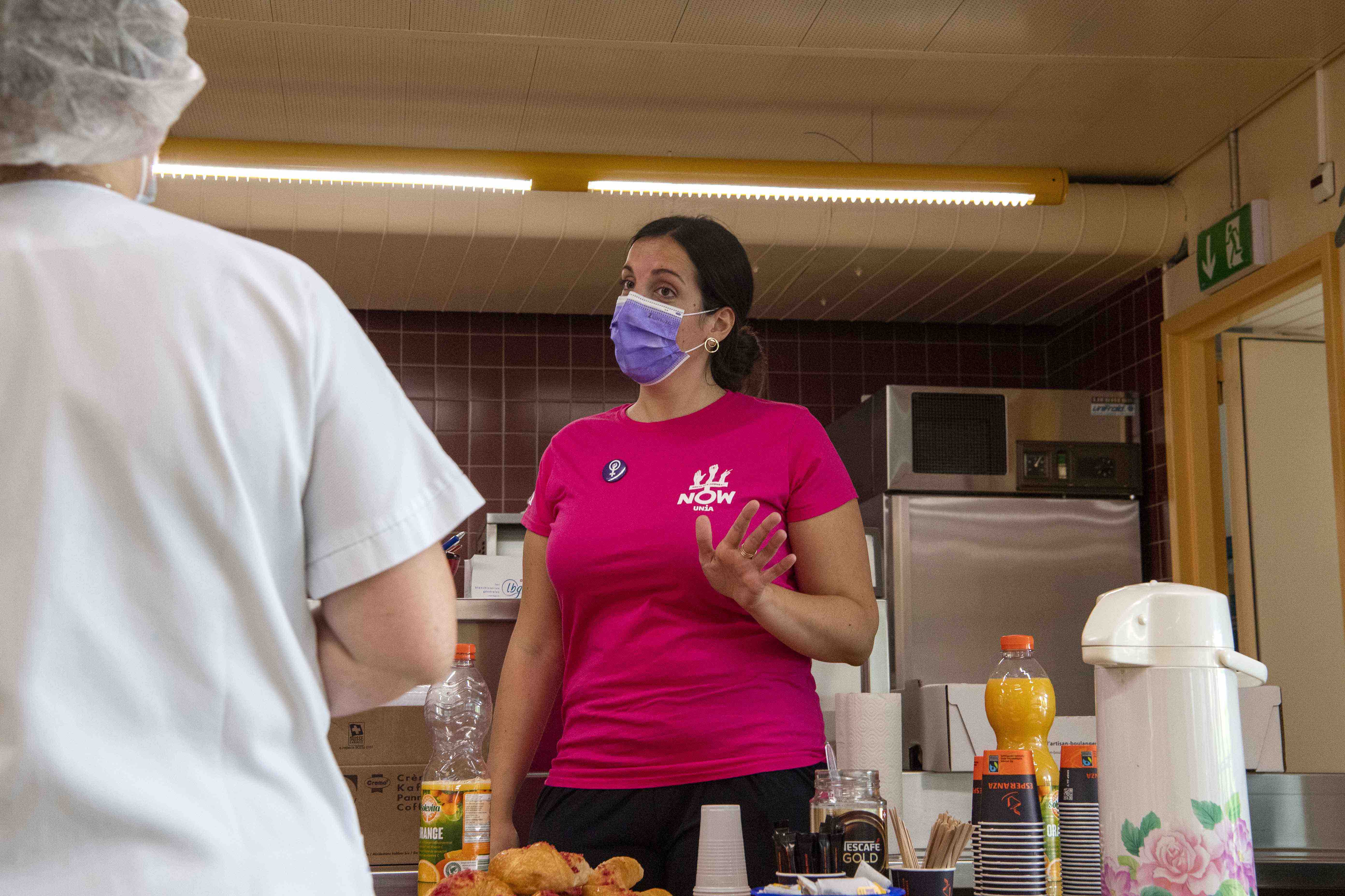 Le temps de parole est compté. La pause dure 15 minutes, pas une seconde de plus. A la sonnerie, les travailleuses sortent de la cafétéria. D’autres arrivent. Trois pauses se succèdent pour échelonner le nombre de personnes dans la salle. Les collaborateurs d’Unia distribuent croissants, cafés, jus d’orange, autocollants, tracts. Une partie des ouvrières épinglent et collent à leur blouse pin’s et autocollants pour l’égalité. «Les chefs ne vont pas aimer, mais cela m’est égal», dit en souriant l’une d’elles. Et pourtant, le message «Pas de réforme de l’AVS sur le dos des femmes!» touche au système et non pas à l’entreprise même.