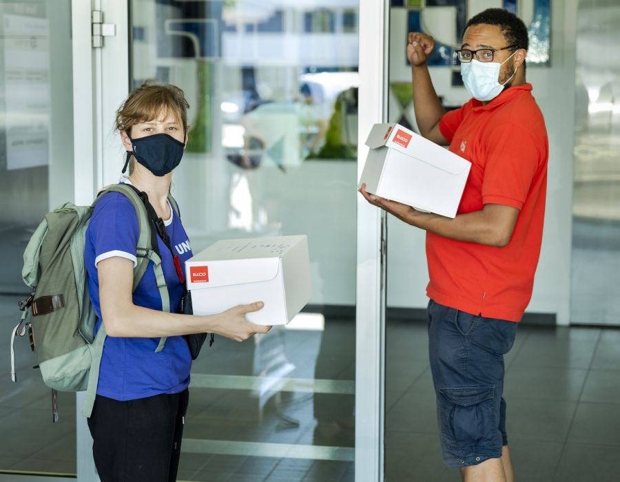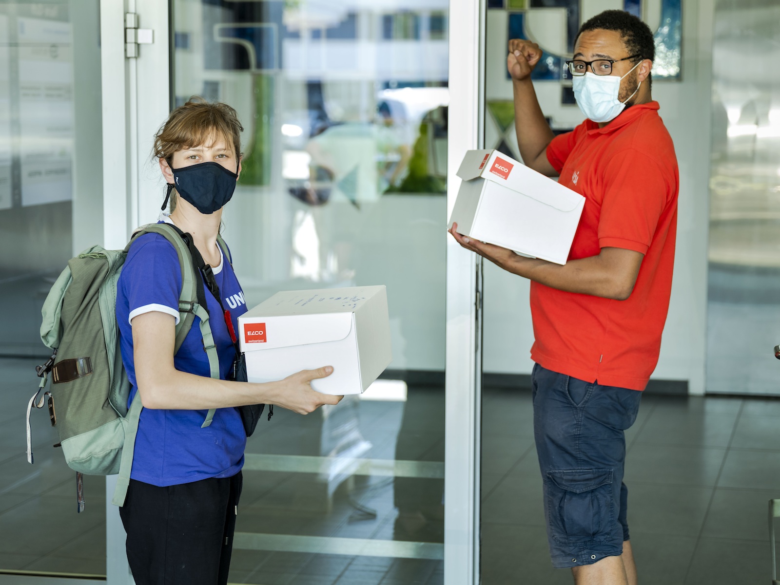 Avec ses collègues d’Unia, Pablo Guscetti, ici à droite lors de la remise des signatures du référendum contre la LHOM, est l’un des artisans de la nouvelle victoire des vendeuses et des vendeurs de Genève.