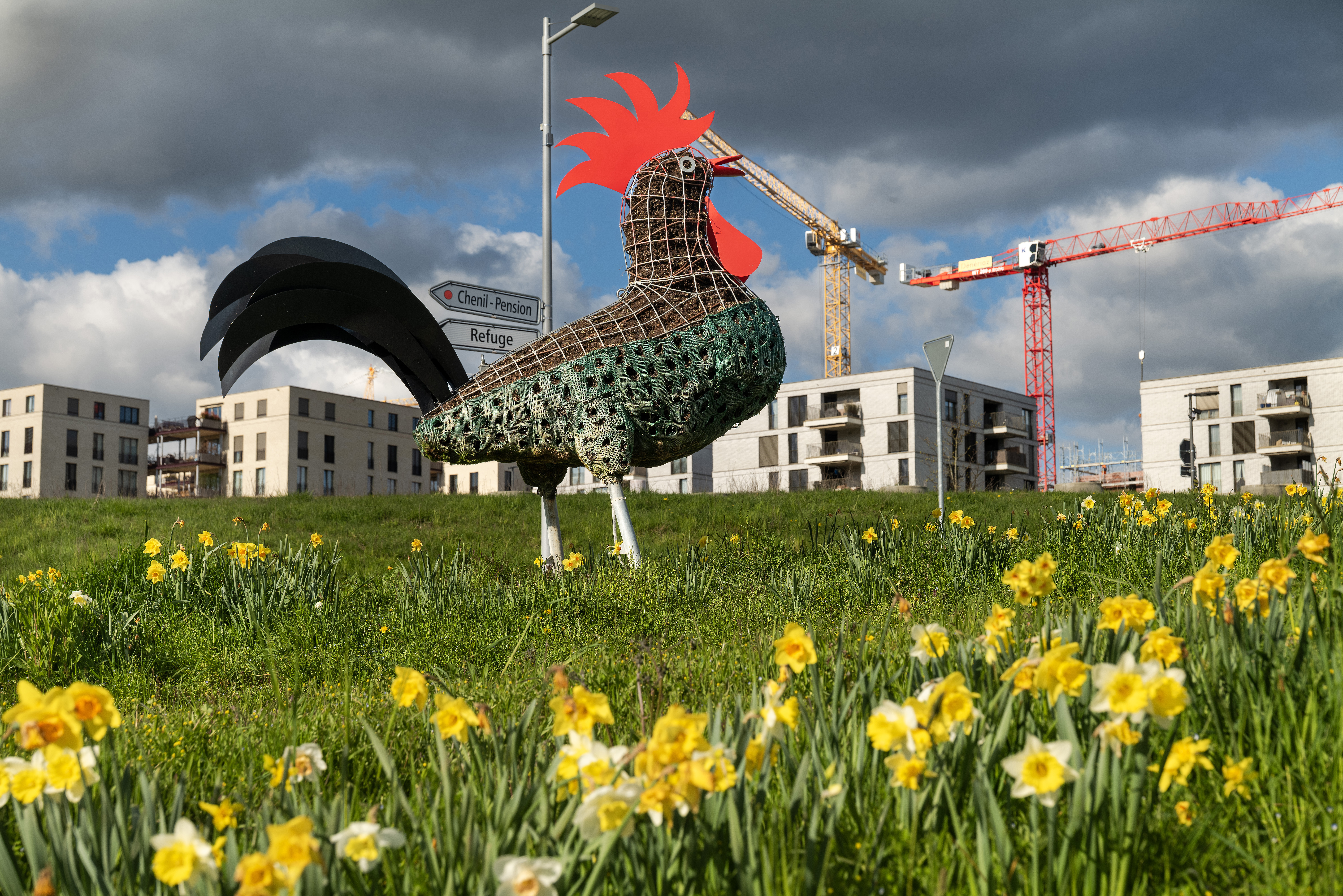 Le coq du carnaval de Bussigny, emblème de la commune, annonce le printemps, sous le regard des grues qui redessinent le paysage dans l'Ouest lausannois. Joyeuses Pâques!