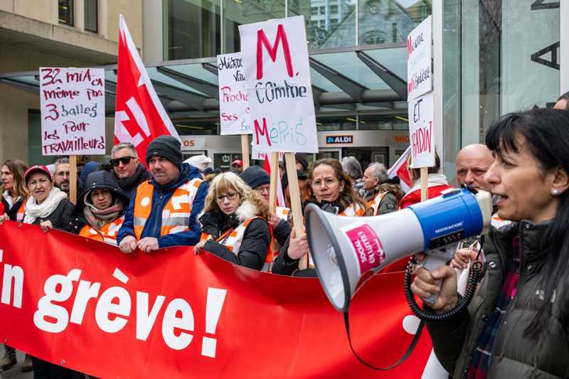 Vers 11h30, les travailleurs rejoignent depuis la place de la Riponne, le centre commercial Métropole 2000 qui abrite la Migros. Des tracts sont distribués – comme au même moment devant d’autres Migros de Suisse romande – et des slogans fusent: «M comme… Mépris!» ou encore «Stop au Micarnage!»