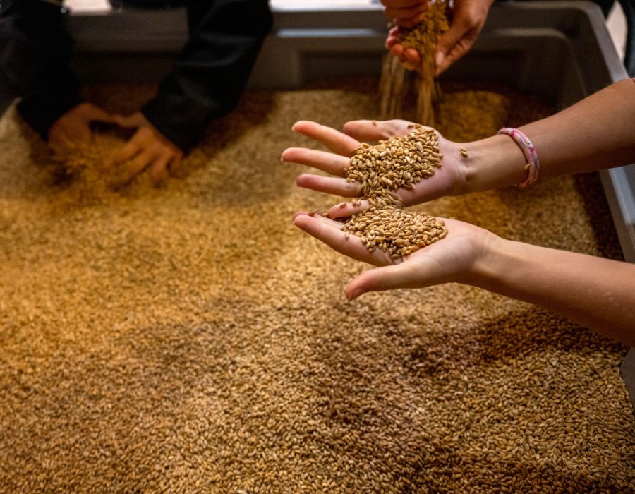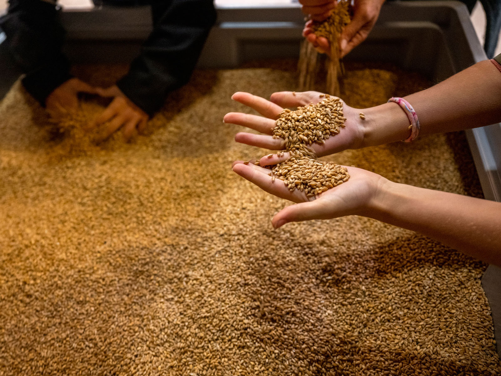 «J’aime la variété de mon métier, même si j’apprécie un peu moins le travail de bureau. J’adore le travail des champs, semer en automne, observer le développement de la céréale, puis les récoltes en été qui représentent la fin d’un cycle…» répond-il aux enfants qui lui posent des questions (lire ci-contre), avant de leur proposer de mettre les mains dans le mélange de grains de blé ancien. «J’aime faire ça aussi, sourit-il en plongeant ses pognes de travailleur. C’est lourd, on sent le cœur au bout des doigts…»
