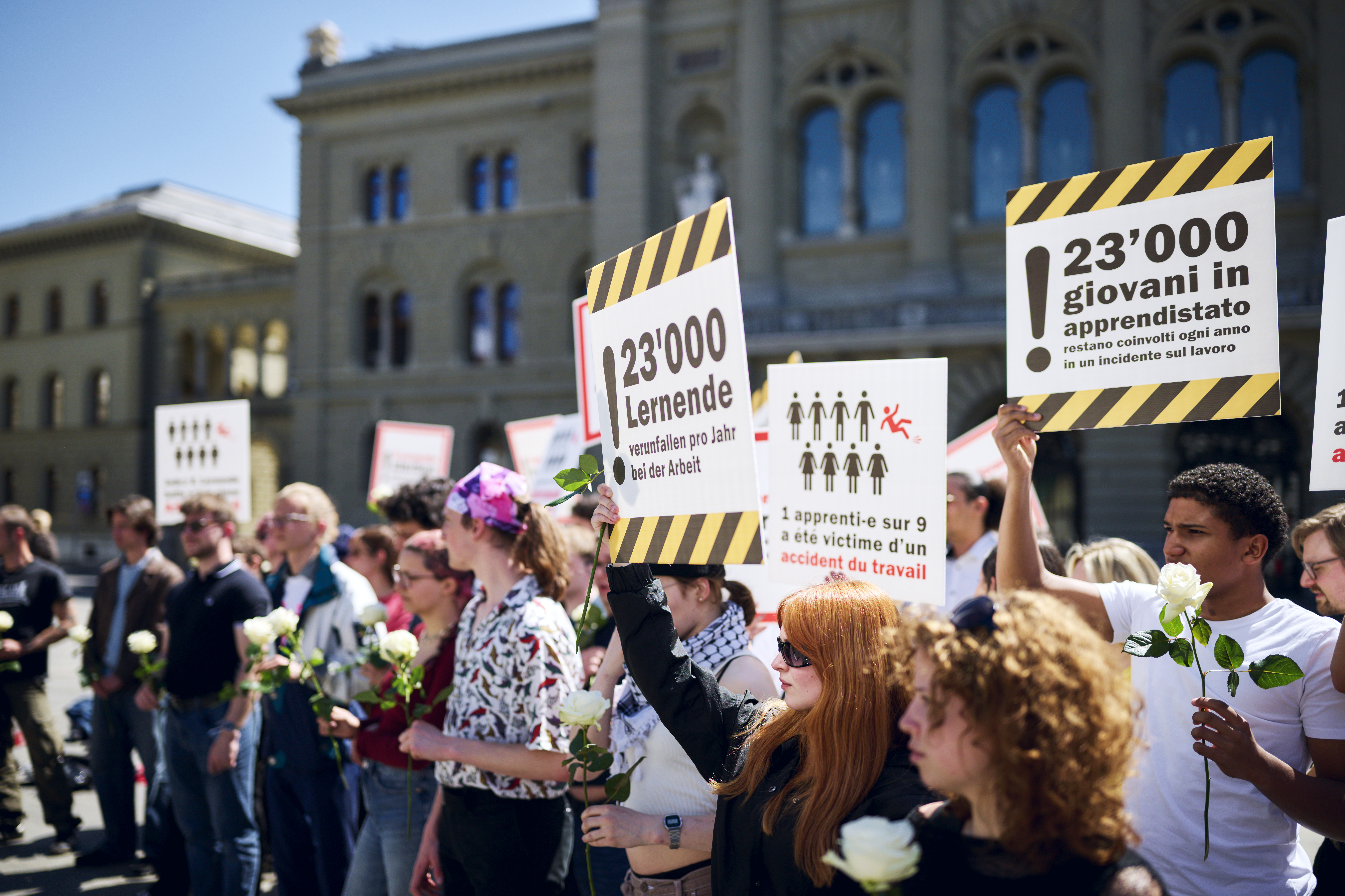Le risque d'accident est deux fois plus important chez les apprentis. Ils étaient une quarantaine le 25 avril devant le Palais fédéral pour dénoncer le manque de protection de ces jeunes sur leur lieu de travail.
