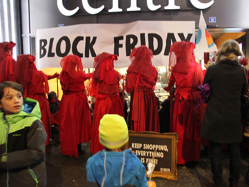 Fin novembre 2019, de nombreux militants et militantes écologistes bloquaient pacifiquement l’entrée principale du Centre commercial de Fribourg.