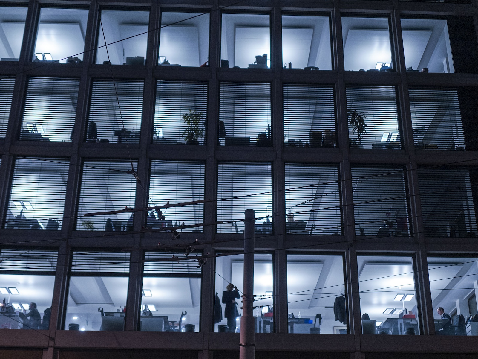 Des bureaux vus de l'extérieur. Des personnes isolées.