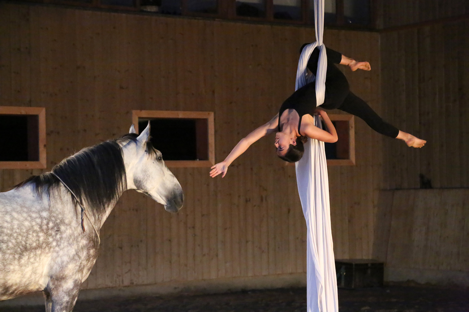 Perdue au milieu du village de Gimel (VD), à l’orée des bois, se cache, en contrebas de la route de Longirod, l’école Shanju. Dissimulée derrière un pâté de maisons, la petite école se fond dans la nature qui l’entoure. Entre caravanes et chevaux, le cadre est idyllique pour quiconque aime la tranquillité. Le 30 juin dernier, en soirée, les deux manèges (intérieur et extérieur) ont accueilli la troupe de Shanju pour une présentation de son travail. Equilibrisme. Voltige. Travail avec des tissus et acrobaties au sol. Empreints de poésie, les numéros se sont enchaînés telles des peintures aux couleurs tantôt sombres puis lumineuses. Point fort de la représentation: une fusion entre hommes et chevaux.