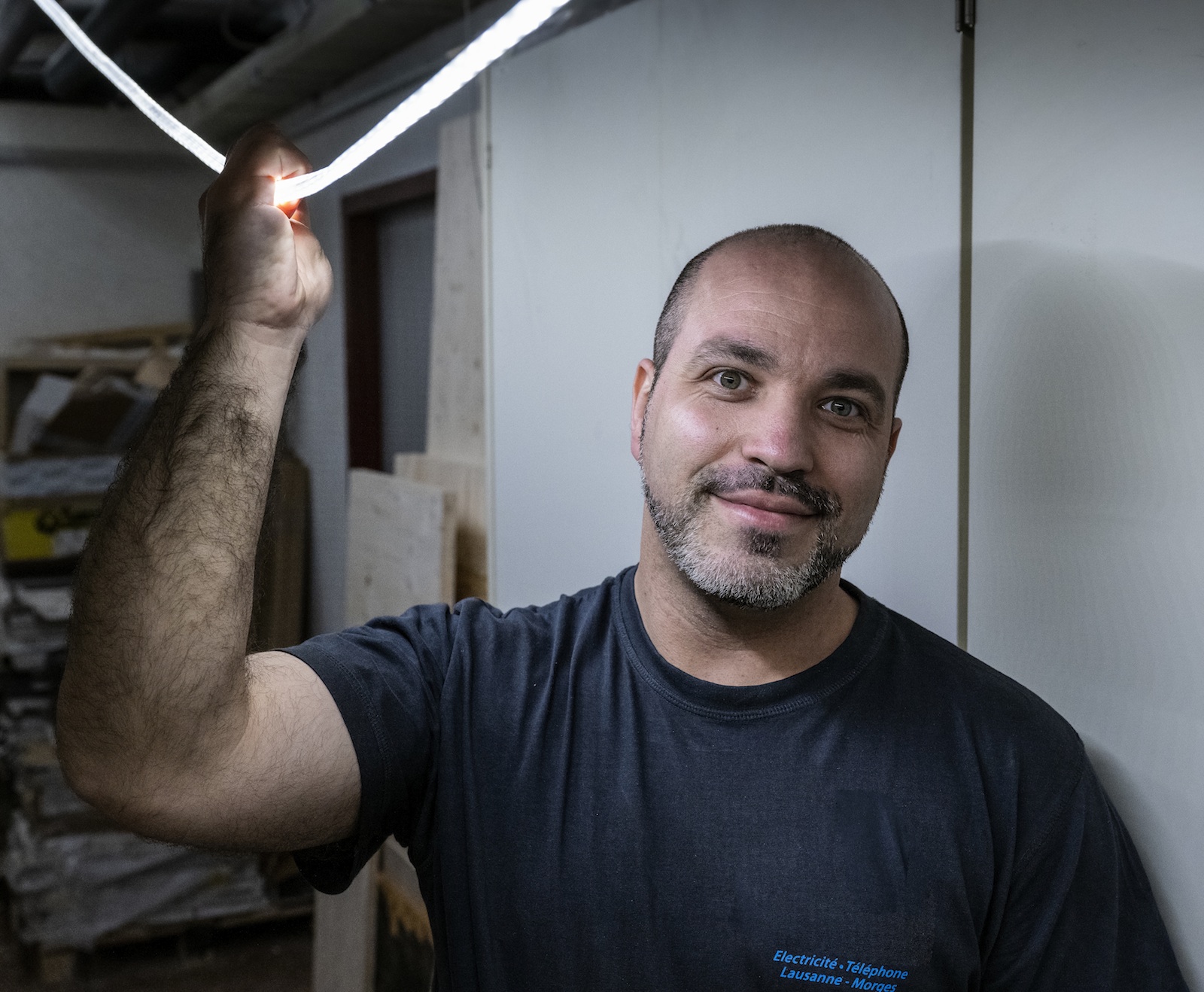 Le temps est compté pour Miguel Viveiros. Electricien, chef de chantier diplômé, il accepte toutefois de nous expliquer les ficelles de son métier. «Une vocation», résume le trentenaire, Portugais d’origine, dont la passion transpire à travers ses explications. Sur le chantier d’un immeuble en rénovation, il présente la remise aux normes du système de chauffage et de climatisation, de l’éclairage, du contrôle d’accès, ainsi que des ascenseurs et des stores. Car la lumière ne représente que la pointe de l’iceberg de la profession. «L’électricien raccorde tout. Il est le premier arrivé et le dernier parti sur le chantier. Il assiste les différents corps de métier: le maçon, le chauffagiste, le sanitaire, le storiste, le ventiliste, le spécialiste du photovoltaïque… mentionne-t-il, un tournevis à la main. C’est un boulot de fourmi. On dirait que ça n’avance pas, jusqu’au moment où on presse sur le bouton, et que ça marche! C’est vraiment satisfaisant de voir notre travail se matérialiser.»