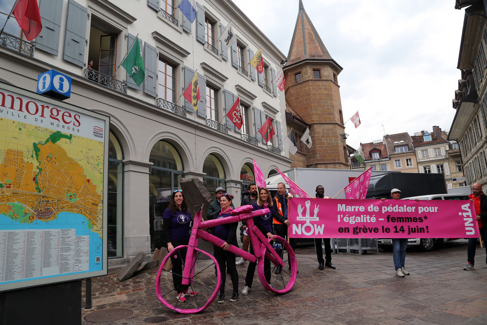 A l’occasion de l’étape du Tour de Romandie à Morges, Unia a rappelé, lors d’une action colorée, l’importance de se mobiliser le 14 juin prochain pour obtenir, enfin, l’égalité