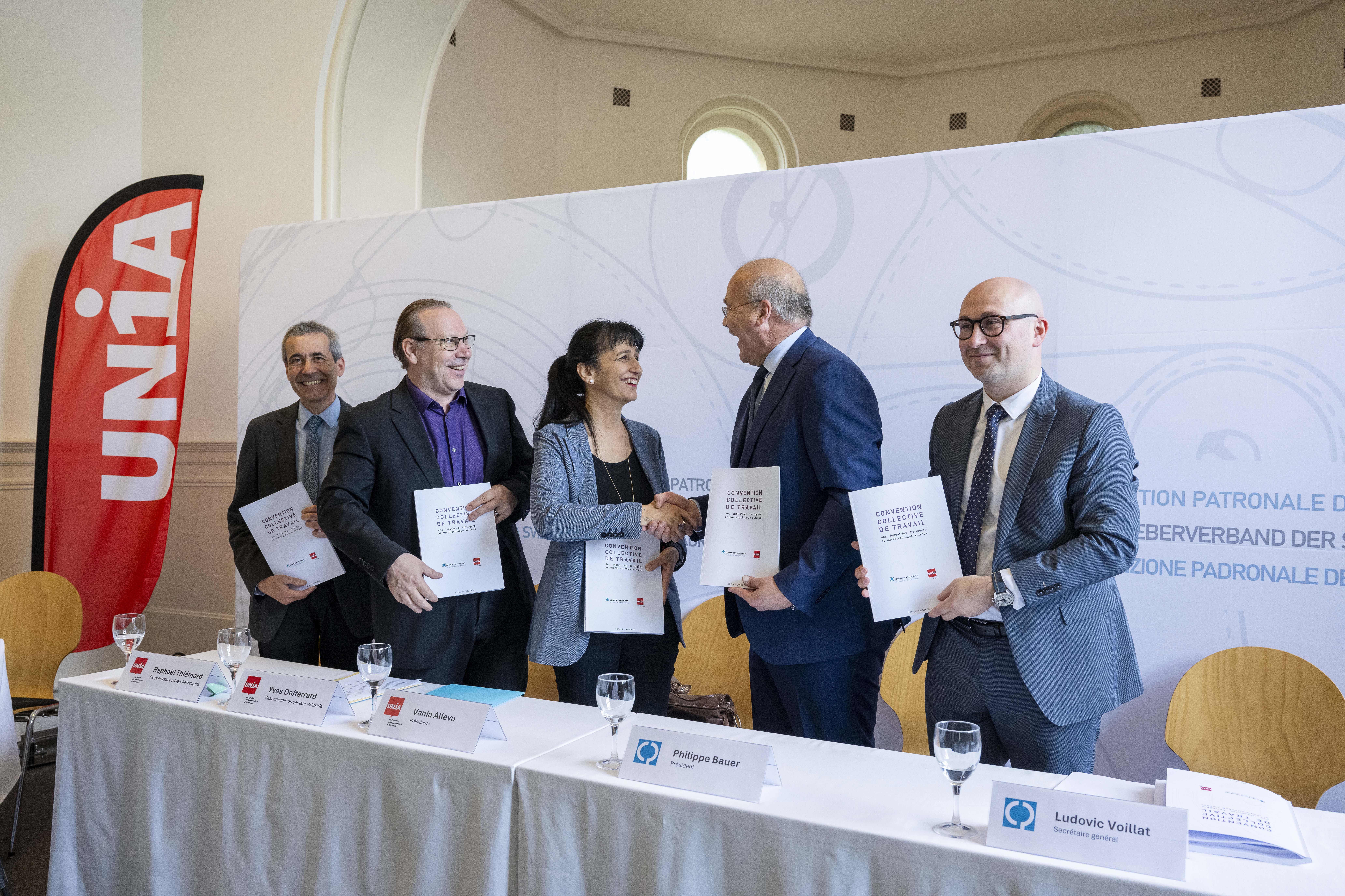 Les trois syndicalistes d’Unia, Raphaël Thiémard, responsable de la branche horlogère, Yves Defferard, membre du comité directeur, et Vania Alleva, présidente, ont signé la nouvelle CCT avec les deux responsables de la Convention patronale de l’industrie horlogère, Philippe Bauer, son président, et Ludovic Voillat, le secrétaire général.