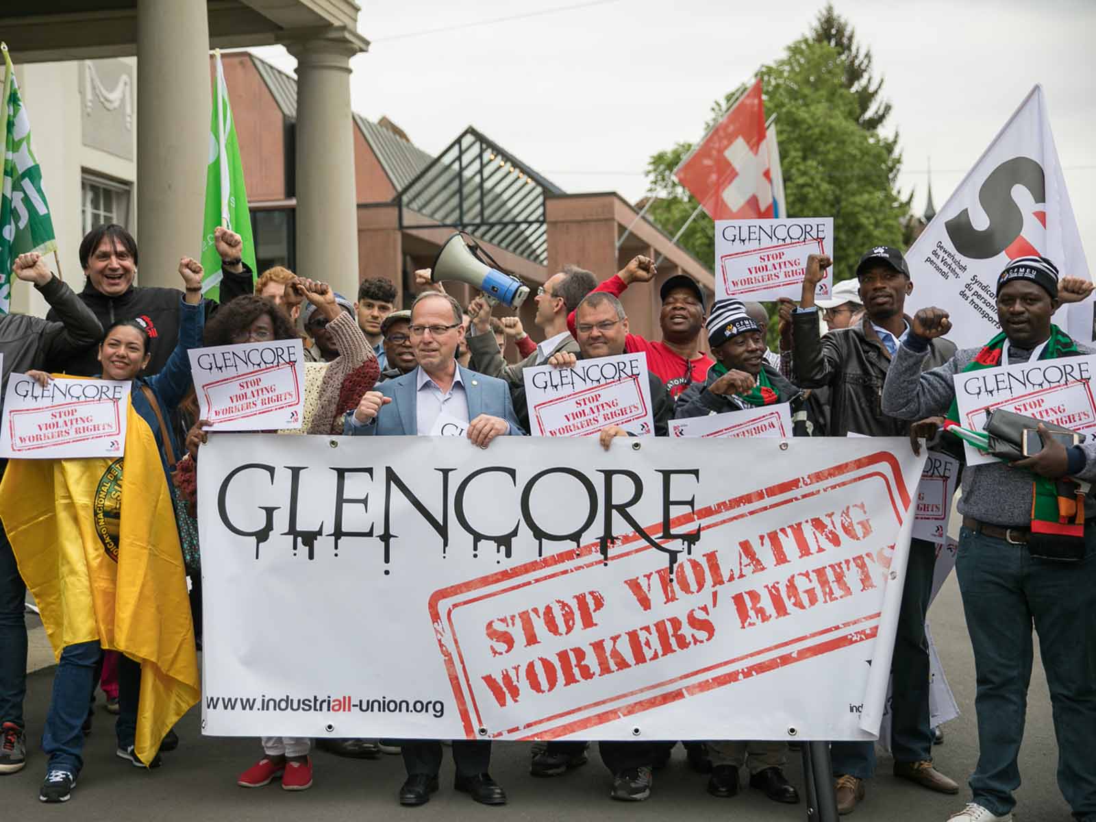 Devant l’Assemblée générale des actionnaires de Glencore à Zoug, une quarantaine de militants syndicaux d’une dizaine de pays ont dénoncé le non-respect des droits humains