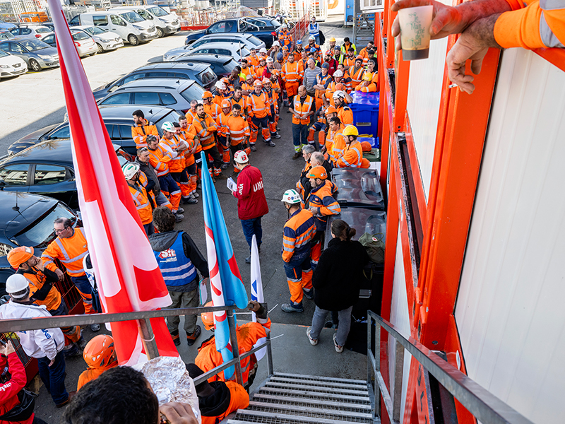 Fin janvier, les syndicats genevois (Unia, Sit et Syna) ont entamé une tournée des chantiers pour interpeller les maçons sur les menaces qui pèsent sur leurs conditions de travail. L’Evénement syndical était présent lors d’une assemblée générale organisée après la pause de midi, sur un chantier du PAV (Praille Acacias Vernets). Une centaine de travailleurs ont répondu présent.
