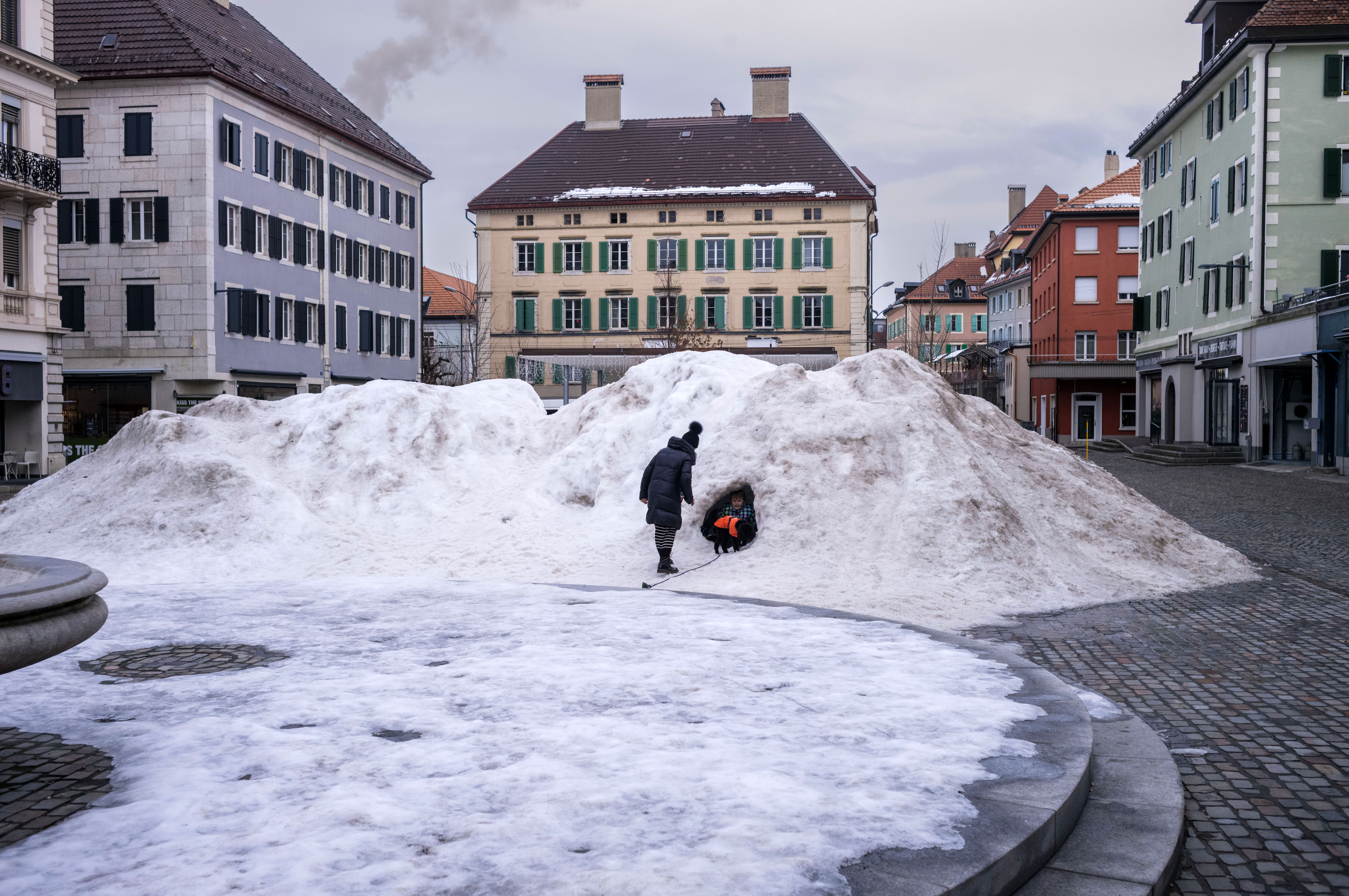 A La Chaux-de-Fonds, les tas de neige façonnent le décor urbain hivernal. Les enfants y jouent jusqu’à ce que l’or blanc vire au gris et devienne l’aire de pause préférée des chiens.