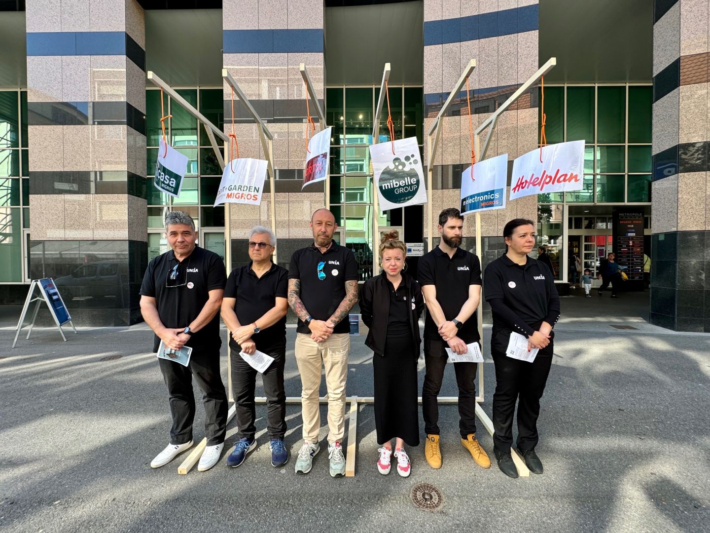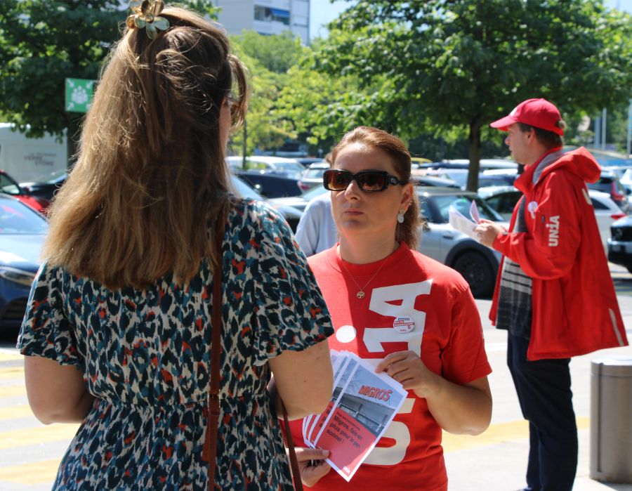 Ce 25 juin, L’Evénement syndical était à Genève, devant le centre commercial MParc La Praille, qui abrite notamment Melectronics, Do it + Garden ou encore Micasa. Une petite dizaine de syndicalistes d’Unia Genève et Vaud ont passé la matinée à informer les clients de la situation. Des tracts et des badges avec l’inscription «Migros: pas de licenciements!» ont été distribués. «Nous sommes solidaires avec tous les salariés de Migros et nous sommes là aujourd’hui pour les sensibiliser sur ce qu’il se passe en coulisses, s’est exprimée Arlette Messi, secrétaire syndicale à Unia Genève. Nous demandons au groupe de stopper les licenciements mais aussi les représailles antisyndicales. Nous exigeons également un plan social qui soit négocié avec les employés et leur syndicat. A Genève, très peu d’informations circulent sur l’avenir des filiales et de leurs employés, car la direction refuse de discuter avec Unia et les employés ont peur de s’exprimer...»