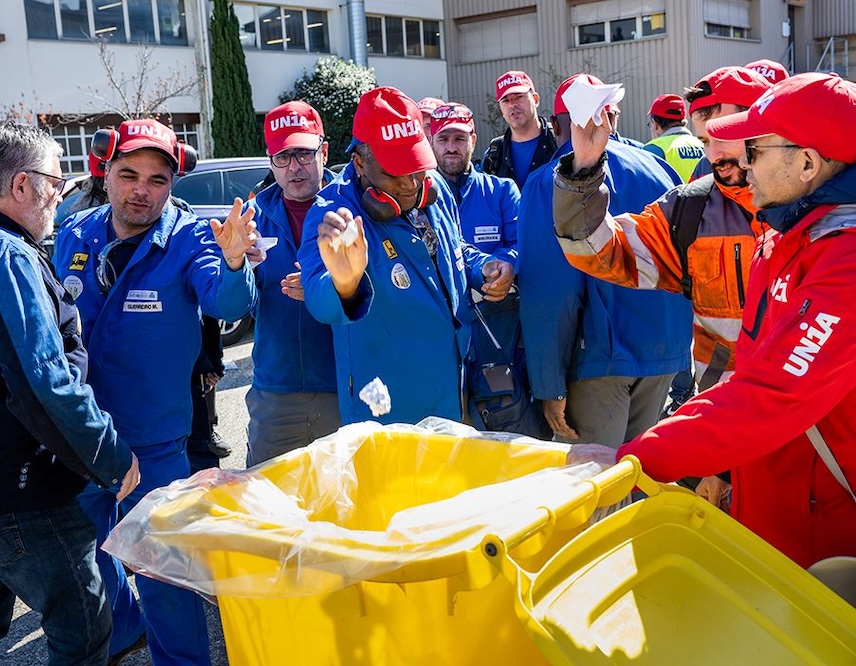 A la veille du week-end de Pâques, une centaine de travailleurs de Vetropack jetent les uns après les autres dans une poubelle le courrier reçu quelques jours avant de la part de leur direction, qui propose un bonus équivalent à un mois de salaire si les objectifs de production pour 2024 sont atteints. «Non au bonus! On veut du travail!», scandent les employés. Les lettres chiffonnées sont ensuite placées dans un colis, accompagnées d’un paquet de cacahuètes en guise de cadeau, puis envoyées à Claude Cornaz, président du conseil d’administration de Vetropack.