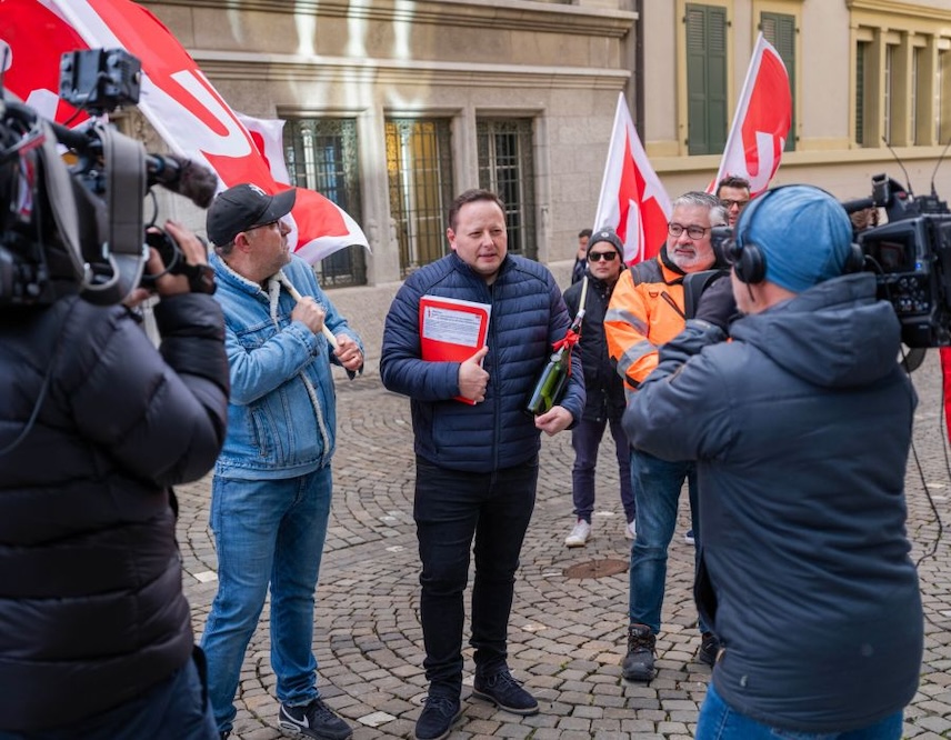 En cette matinée glaciale du 23 avril, une dizaine de travailleurs de Vetropack accompagnés d’Unia remettent une pétition munie de plus de 5000 signatures au président du Grand Conseil. Ils demandent le maintien de la dernière verrerie industrielle de Suisse, la préservation des 175 emplois et d’un savoir-faire unique. Ils offrent également une bouteille, comme un symbole de celles qu'on lance à la mer.