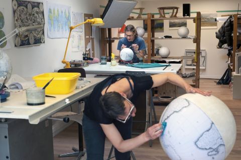 A midi, on avale des sandwichs. Puis, arrive Cécile Blary, 44 ans, graphiste de formation. Toute première employée de cette entreprise individuelle, elle est là depuis quelques mois. Je la regarde couper au cutter la carte imprimée. Pour qu’elle puisse être apposée sur un support convexe, elle a la forme de fuseaux. Ces formes oblongues – représentant chacune une zone de la carte définie entre deux méridiens – permettent ensuite d’épouser la courbure de la Terre. Cécile plonge ses fuseaux dans l’eau avant de les positionner à la main sur un globe. Méticuleuse, patiente à l’infini.