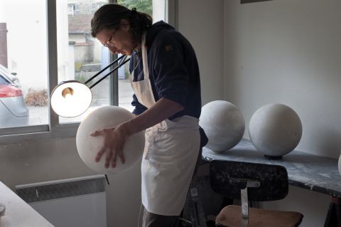 Dans le vestibule de l’atelier, une dizaine de globes miniatures. Premier prix: 250 euros, pour ceux de 21 centimètres de diamètre. On n’en fait pas un achat compulsif. Les autres, 32, 50 ou 80 centimètres, montent jusqu’à 8000 euros. Alain ne l’avait pas prévu, mais son activité frôle l’univers du luxe. Je vais bientôt découvrir la complexité de leur fabrication mais, pour le moment, nous buvons un café sur une table d’architecte dans la pièce principale, bel espace lumineux.