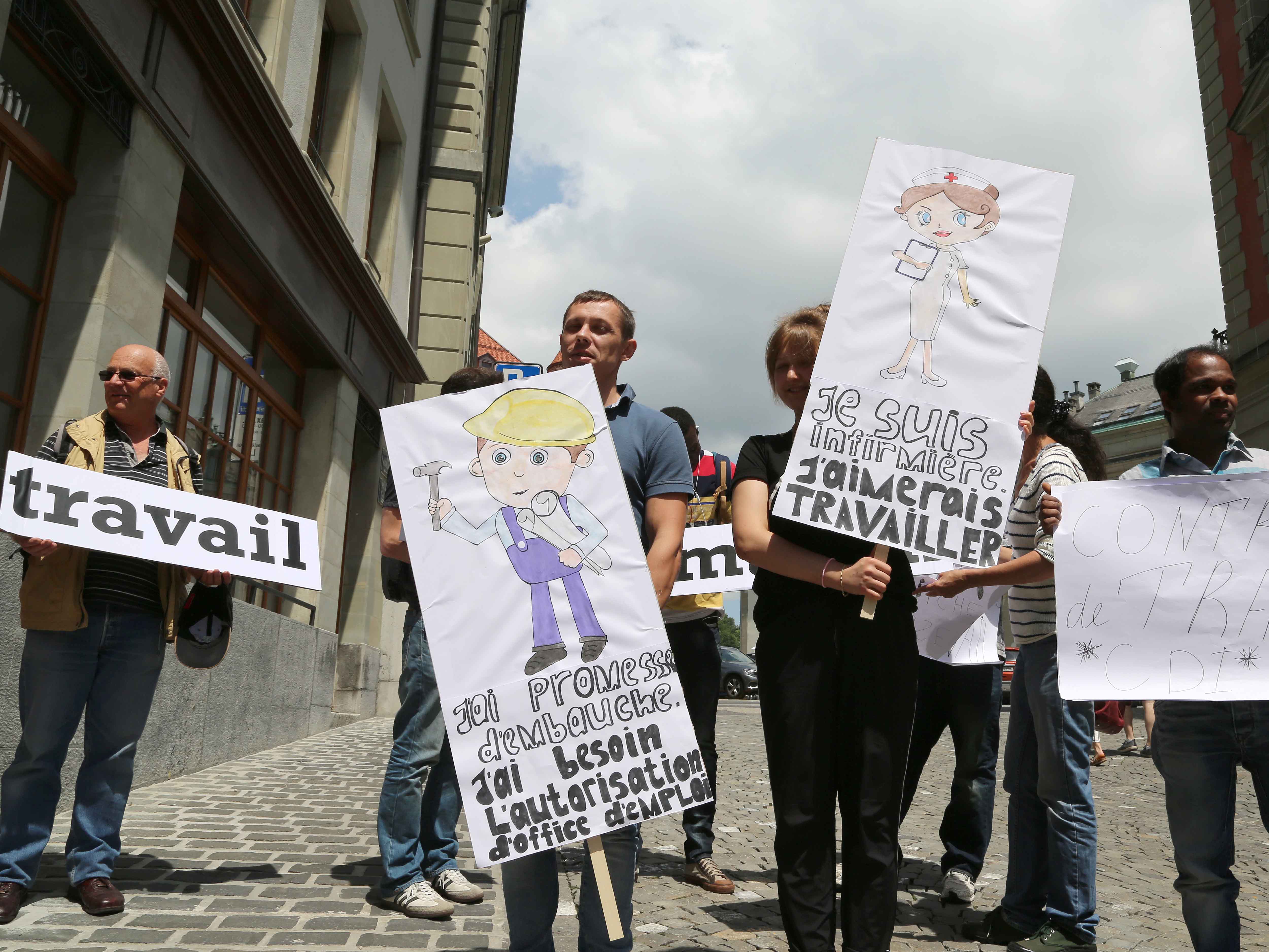 Arrivé en janvier 2012, Dzmitry Toustsik est l’une de ces personnes déboutées de l’asile. Biélorusse, il témoigne dans un français presque parfait: «J’aurais la possibilité de travailler comme cuisinier, mécanicien, informaticien. Mais à chaque fois, le patron me demande mon permis de travail.» Devant le Grand Conseil vaudois, il tient une pancarte: «J’ai une promesse d’embauche, j’ai besoin de l’autorisation de l’office de l’emploi.» Depuis qu’il est à l’aide d’urgence, à la suite du rejet de sa demande d’asile il y a quatre ans, le monde du travail lui est interdit. La situation est identique pour son épouse, infirmière de métier. Leurs deux filles de 5 et 9 ans sont scolarisées, et leur troisième enfant verra le jour en juin.