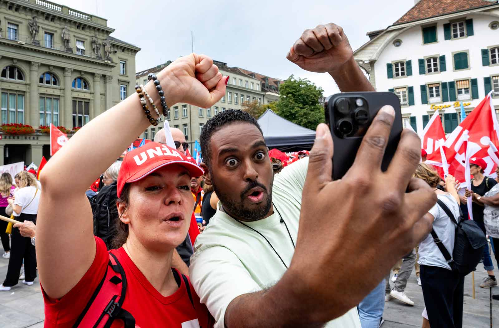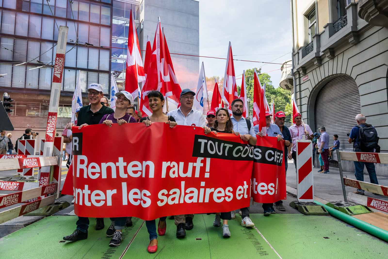 La gauche et les syndicats ont réussi leur rentrée sociale le samedi 16 septembre à Berne. Haute en couleur, la manifestation salariale a drainé des quatre coins du pays jusqu’à 20000 personnes, selon les organisateurs, de tous horizons professionnels. On a pu croiser des travailleurs du bâtiment et de l’industrie, des employés des transports, des services publics, de l’hôtellerie-restauration et de la vente, des électriciens, des postiers, des imprimeurs, des enseignants ou encore du personnel soignant, beaucoup de retraités et des militants des partis de gauche, des jeunes marxistes et des libertaires.