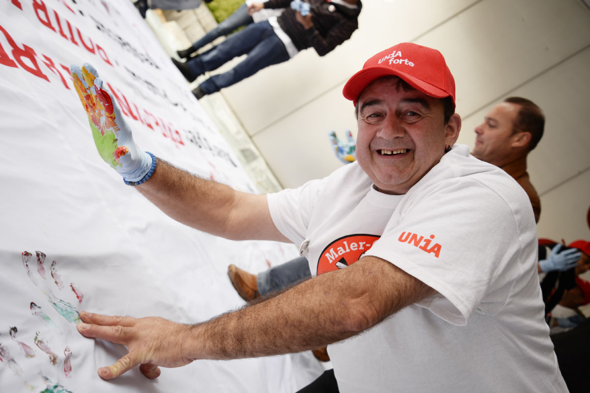 Le 19 octobre, une centaine de délégués d’Unia se sont réunis à Zurich en assemblée générale. Ils ont réaffirmé leurs revendications pour mieux protéger leur secteur à l’avenir et obtenir des conditions de travail et de salaires progressistes et dignes, à la hauteur de la valeur du travail qu’ils fournissent et qui demande un grand savoir-faire. Les délégués ont ainsi fait entendre très clairement à l’association patronale leurs exigences et celles de plus de 1500 plâtriers et peintres ayant contresigné une pétition pour améliorer leur statut. Une grande banderole, garnie des empreintes colorées des délégués, a été réalisée à cette occasion et porte leur slogan: «Pour un avenir haut en couleur!»