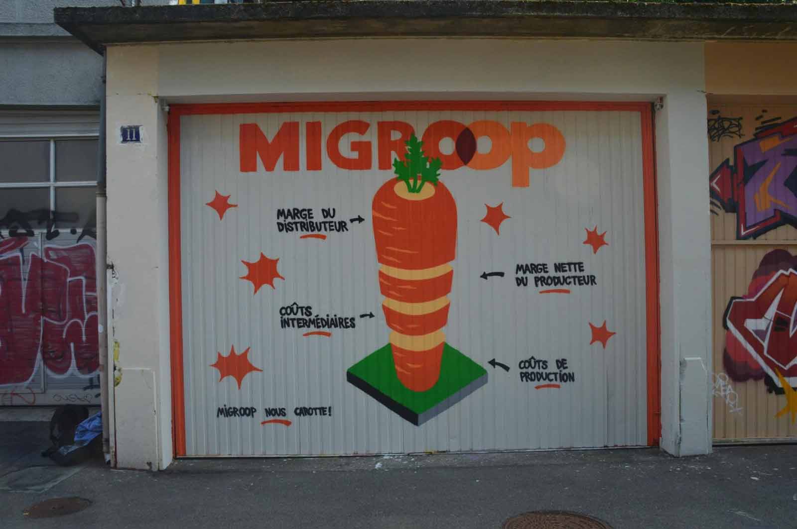 Cet été, le collectif Grondements des terres, par diverses actions, a mis en évidence les profits de Coop et de Migros au détriment du monde paysan et des consommateurs. © Grondements des terres
