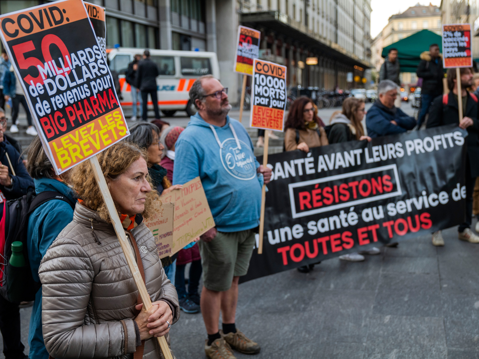 «Face à l’urgence sanitaire, nous demandons la levée pure et simple des brevets sur les vaccins anti-Covid ainsi que le transfert de technologies et la réquisition des entreprises de fabrication afin de développer massivement l’accès aux vaccins pour tous, partout dans le monde», exige le Dr Frank Prouhet, médecin français et animateur du Collectif Brevets sur les vaccins anti-Covid stop, réquisition!, qui regroupe 43 organisations européennes, venu manifester à Genève le 13 octobre aux côtés d’une septantaine de personnes. «La non-levée de ces brevets est synonyme de mortalité aggravée, on ne peut pas continuer comme cela!»