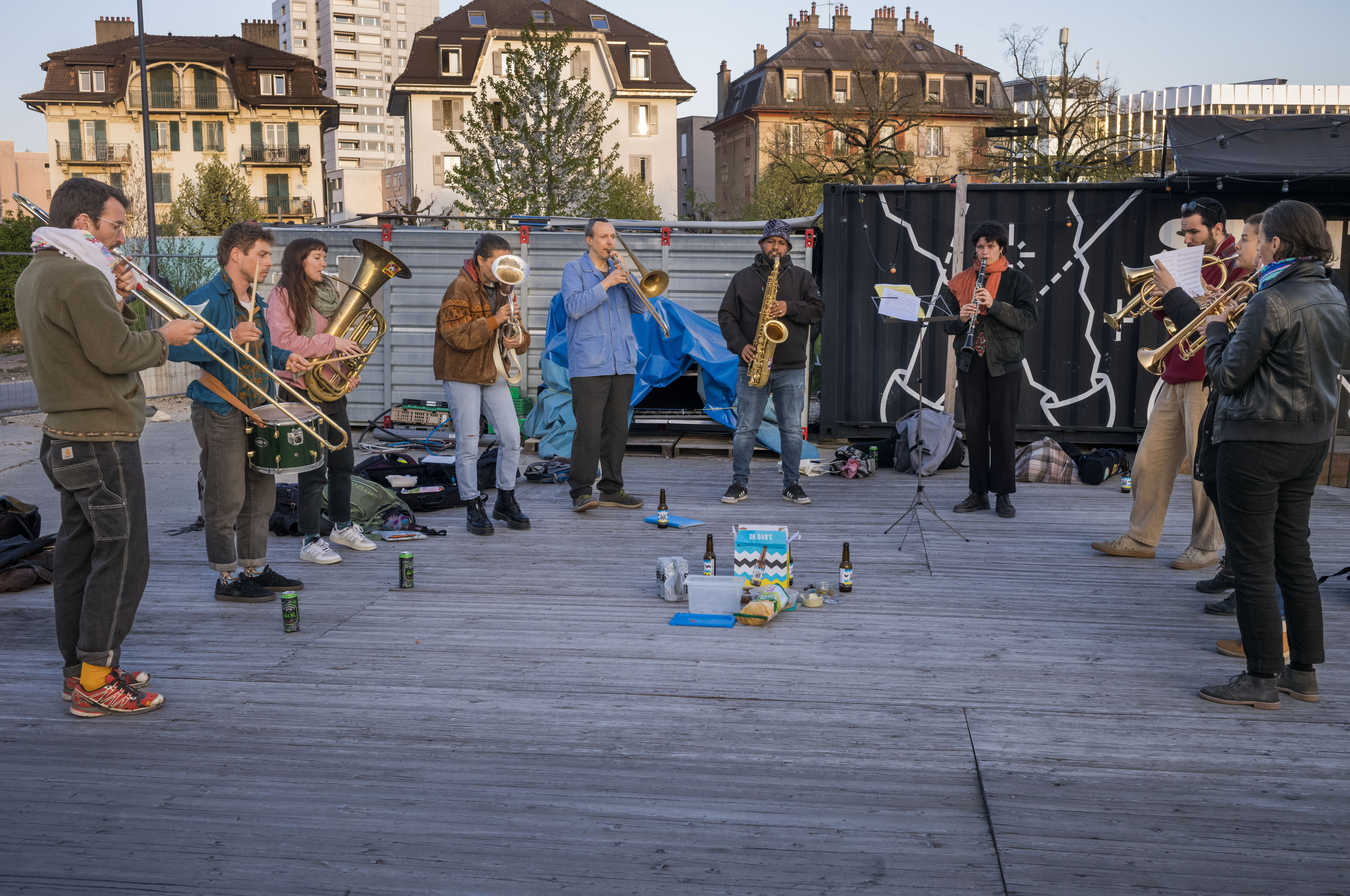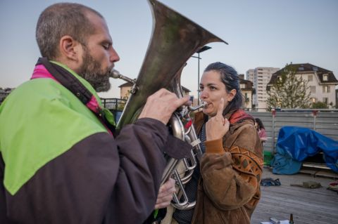 Unis par la musique et par leur sensibilité, les membres de la Fanfare militante de Lausanne sont loin d’être homogènes. Ils ont entre 20 et 50 ans, travaillent dans le social, la santé, les arts, l’environnement… Il y a aussi un mécanicien et un électricien. Le premier, Romain, raconte avoir joué à Nantes dans une fanfare militante, et vécu à la ZAD de Notre-Dame-des-Landes. «Ma clarinette est en réparation, mais j’avais besoin, après une journée de travail sur le chantier de venir ici. Ça me fait du bien. On prend du bon temps, on joue, on chante.» Après un cursus ouvrier, il a étudié la musicologie. «Ici, on joue sur une friche, où courent des rats. C’est… de l’art total.» Il rit, avant d’écouter attentivement ses camarades.