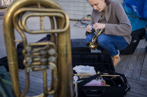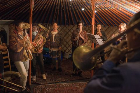 La quinzaine de musiciens se met à répéter avec assiduité. Lorsqu’un vent frais se lève, elle se réfugie dans la chaleur de la yourte. Tout naturellement, un cercle musical se reforme dans l’antre. Pendant deux heures, les notes s’envolent. Parfois, des paroles s’échangent, les plus aguerris donnent des directions, sans jamais diriger en tant que tel, sur la structure, les parties, l’intro des trompettes, l’arrivée des anches, les motifs, les mesures… le crescendo. «Ce serait bien d’arriver un peu moins bourrin. Etre un peu plus doux. Généralement, c’est toujours mieux quand on commence doucement», indique Jeanne.