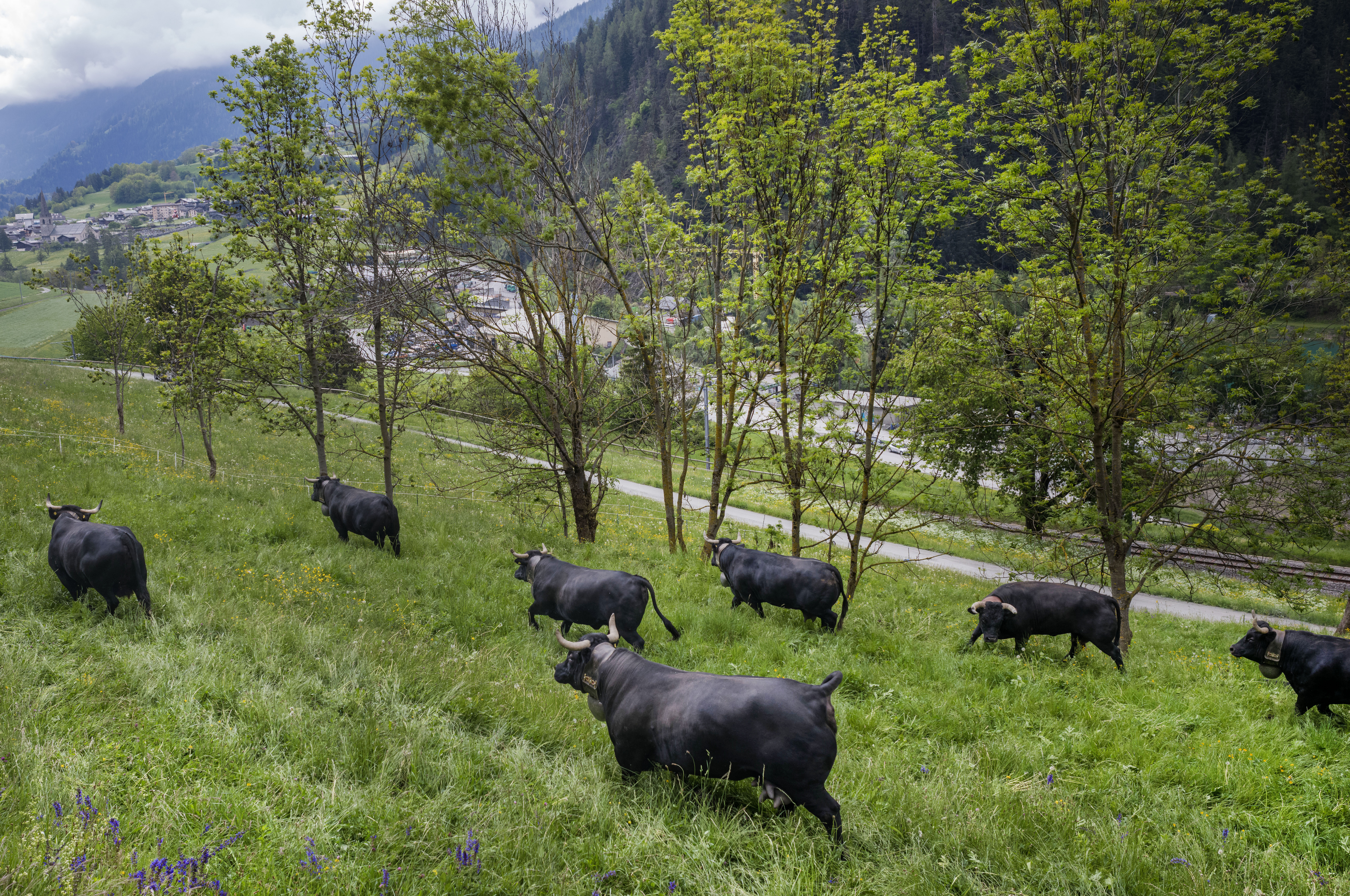 Les vaches de la race d’Hérens, Madrid, Disco, Babylone, Baïkal, Bayonne, Fougue, Bahi, retrouvent les pâturages avec joie et allégresse à Villette dans le Val de Bagnes. Une première étape avant la montée à l’alpage.