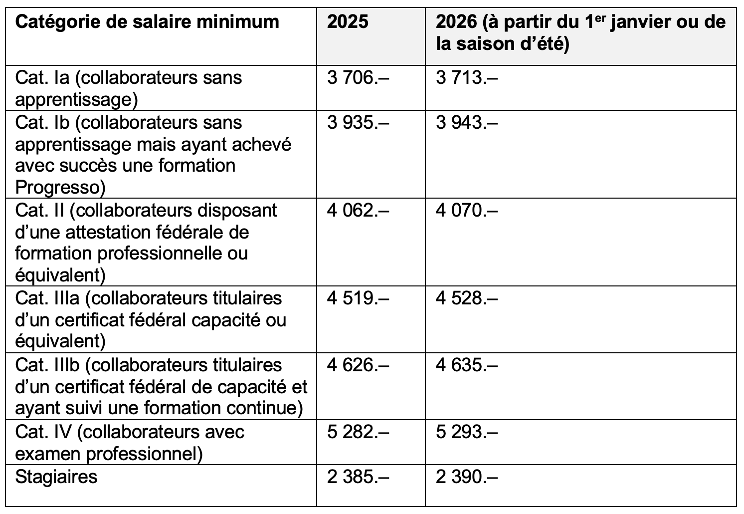 Salaires minimums mensuels 2026 en CHF (bruts) conformément à la CCNT:
