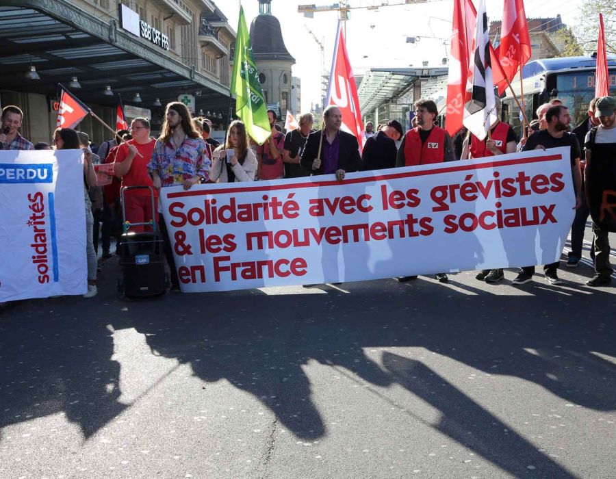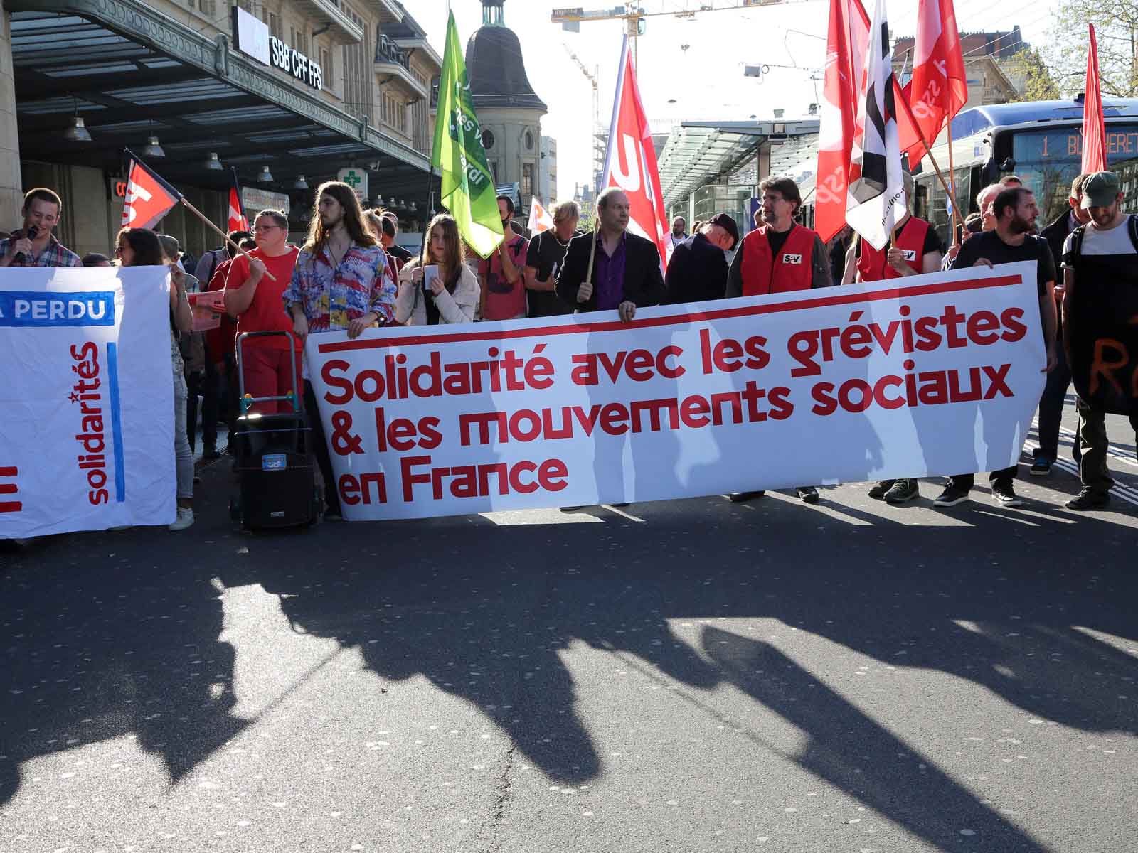 Le 19 avril, un rassemblement unitaire de soutien aux mouvements sociaux en France a réuni syndicats, partis et associations devant la gare de Lausanne