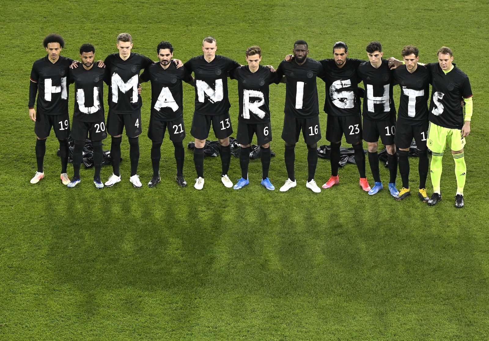 L’équipe norvégienne a fait des émules: avant le coup d’envoi d’un match de qualification pour la Coupe du monde contre l’Islande, le 25 mars dernier, les joueurs allemands de la Mannschaft ont arboré des maillots appelant au respect des droits humains.