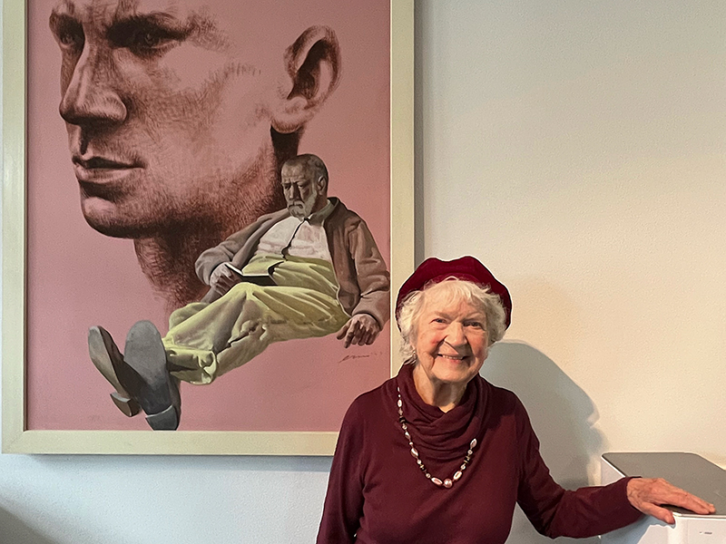 Lors de sa visite à l’Union syndicale suisse à Berne en octobre, plus de 70 ans après y avoir travaillé, Yvonne Paccaud pose devant l’affiche réalisée à l’occasion de la votation sur l’AVS du 6 juillet 1947 par le peintre Hans Erni.