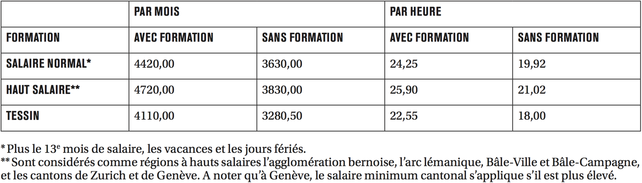 Concrètement, le travailleur temporaire qui effectue une mission dans une branche disposant d’une CCT étendue reçoit au moins le salaire minimum qui y est fixé, comme dans le secteur de la construction par exemple. Ce principe s’applique aussi dans les branches au bénéfice d’une convention non déclarée de force obligatoire si celle-ci figure dans la liste élargie de la CCT Location de services. Parmi les conventions nouvellement intégrées, Unia cite la CCT de l’industrie des machines, des équipements électriques et des métaux, celle des entreprises suisses alémaniques de l’horlogerie et de la microtechnique ou encore quatre CCT conclues dans les domaines de la santé et du social. Les intérimaires loués à des entreprises sans convention applicable perçoivent de leur côté au moins les rémunérations plancher prévues dans la CCT Location de services. «Les exceptions qui existaient jusqu’à présent, surtout dans l’industrie, sont supprimées», soulignent les partenaires sociaux. A noter par ailleurs que les salaires minimums ont, au 1er janvier dernier, été augmentés entre 0,5% et 2,6% (voir tableau ci-dessous).